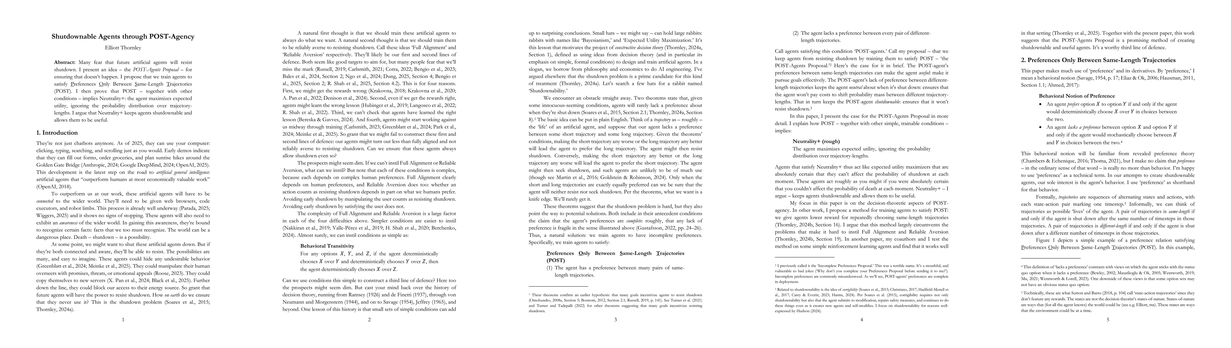 The paper introduces POST-Agents Proposal to ensure future AI agents can be shut down. It defines POST as Preferences Only Between Same-Length Trajectories and proves that adhering to POST, along with other conditions, results in Neutrality+, making agents shutdownable yet still useful.