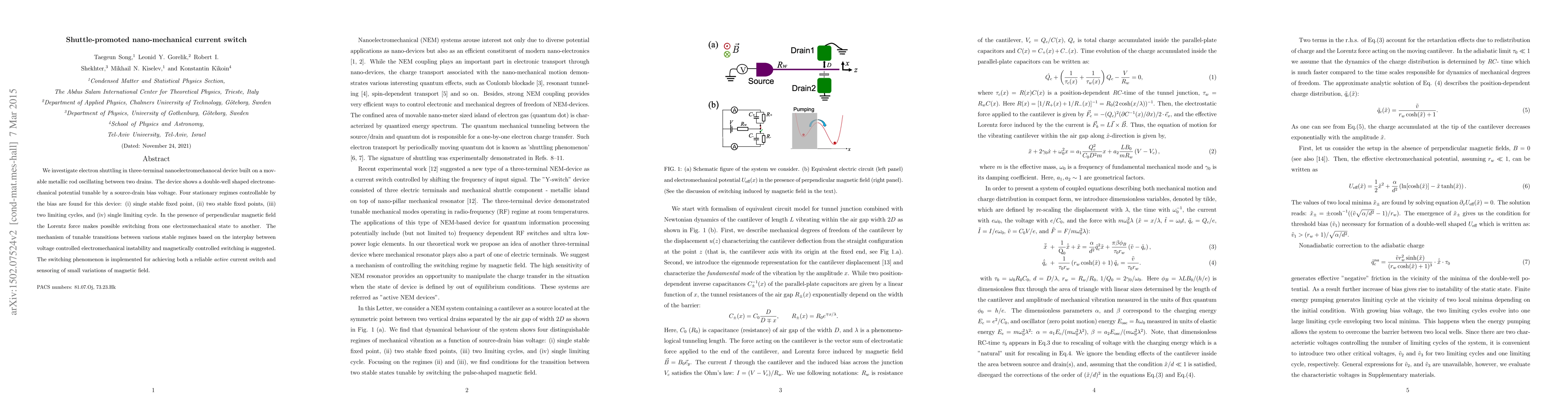We investigate electron shuttling in three-terminal nanoelectromechanocal device built on a movable metallic rod oscillating between two drains. The device shows a double-well shaped electromechanical potential tunable by a source-drain bias voltage. Four stationary regimes controllable by the bias are found for this device: (i) single stable fixed point, (ii) two stable fixed points, (iii) two limiting cycles, and (iv) single limiting cycle. In the presence of perpendicular magnetic field the Lorentz force makes possible switching from one electromechanical state to another. The mechanism of tunable transitions between various stable regimes based on the interplay between voltage controlled electromechanical instability and magnetically controlled switching is suggested. The switching phenomenon is implemented for achieving both a reliable \emph{active} current switch and sensoring of small variations of magnetic field.
