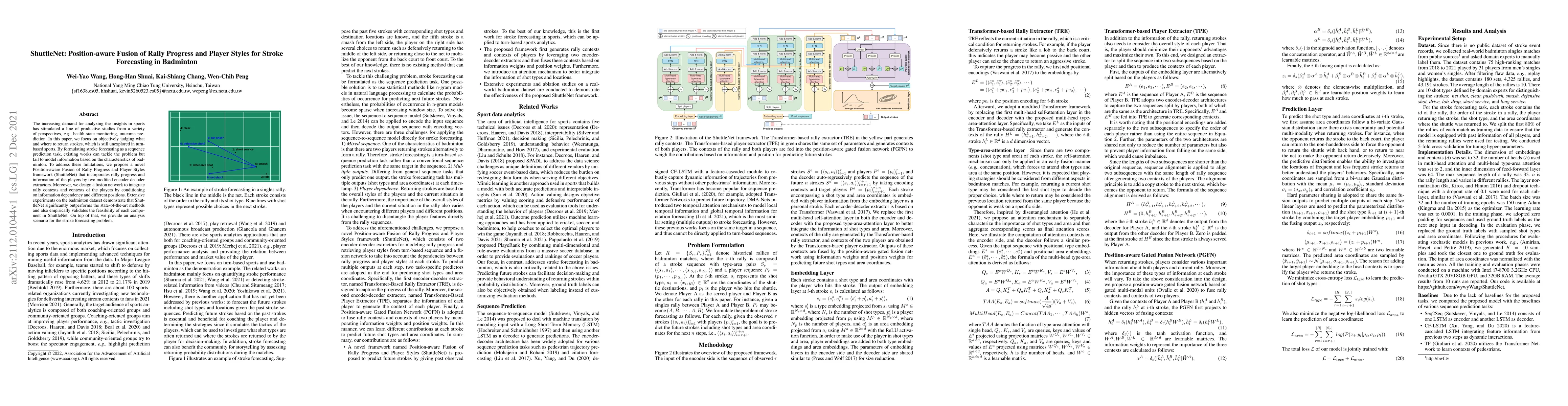The paper proposes ShuttleNet, a Position-aware Fusion of Rally Progress and Player Styles framework for stroke forecasting in badminton. It uses a Transformer-based rally extractor (TRE) and a Transformer-based player extractor (TPE) to generate rally and player contexts, respectively. A position-aware gated fusion network integrates these contexts, considering information dependency and position weights.