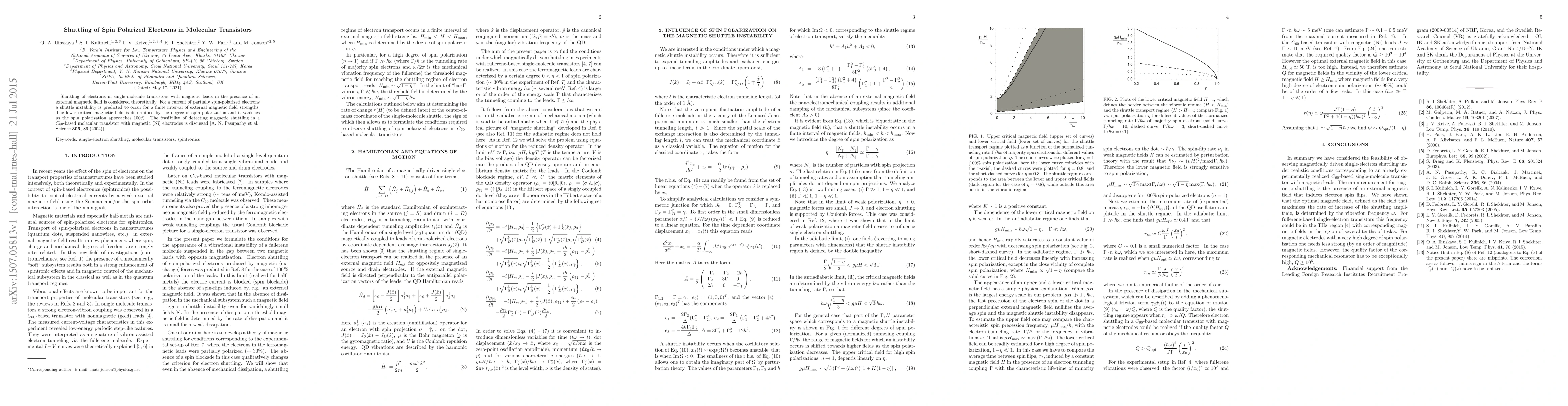 This paper theoretically investigates the shuttling of spin-polarized electrons in single-molecule transistors with magnetic leads, predicting a shuttle instability under certain magnetic field strengths. The lower critical magnetic field is shown to depend on the degree of spin polarization, vanishing at 100% polarization.