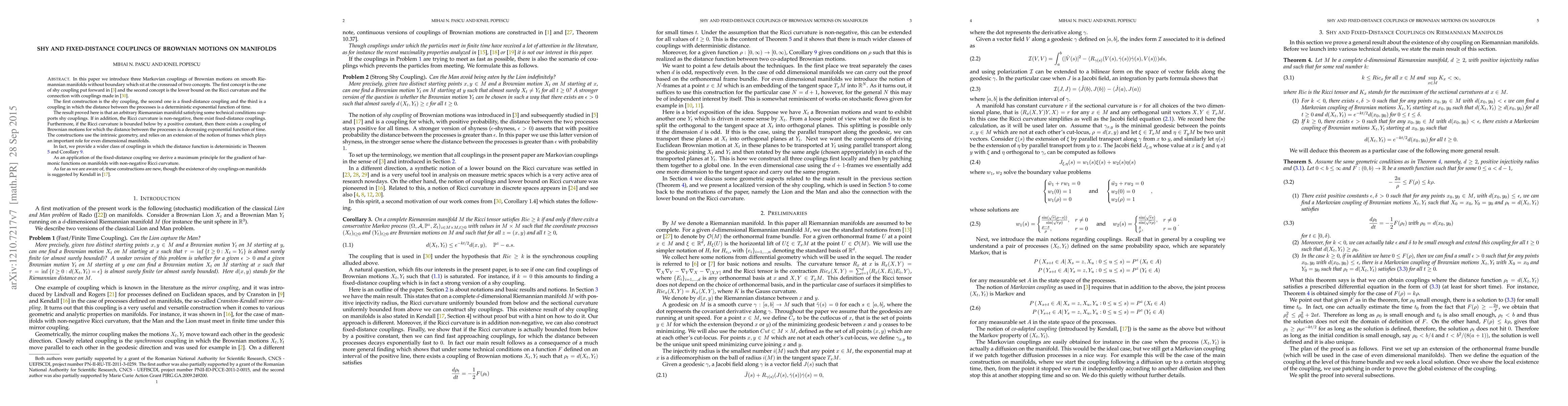 In this paper we introduce three Markovian couplings of Brownian motions on smooth Riemannian manifolds without boundary which sit at the crossroad of two concepts. The first concept is the one of shy coupling put forward in \cite{Burdzy-Benjamini} and the second concept is the lower bound on the Ricci curvature and the connection with couplings made in \cite{ReSt}. The first construction is the shy coupling, the second one is a fixed-distance coupling and the third is a coupling in which the distance between the processes is a deterministic exponential function of time. The result proved here is that an arbitrary Riemannian manifold satisfying some technical conditions supports shy couplings. If in addition, the Ricci curvature is non-negative, there exist fixed-distance couplings. Furthermore, if the Ricci curvature is bounded below by a positive constant, then there exists a coupling of Brownian motions for which the distance between the processes is a decreasing exponential function of time. The constructions use the intrinsic geometry, and relies on an extension of the notion of frames which plays an important role for even dimensional manifolds. In fact, we provide a wider class of couplings in which the distance function is deterministic in Theorem \ref{t:100} and Corollary~\ref{Cor:9}. As an application of the fixed-distance coupling we derive a maximum principle for the gradient of harmonic functions on manifolds with non-negative Ricci curvature. As far as we are aware of, these constructions are new, though the existence of shy couplings on manifolds is suggested by Kendall in \cite{Kendall}.