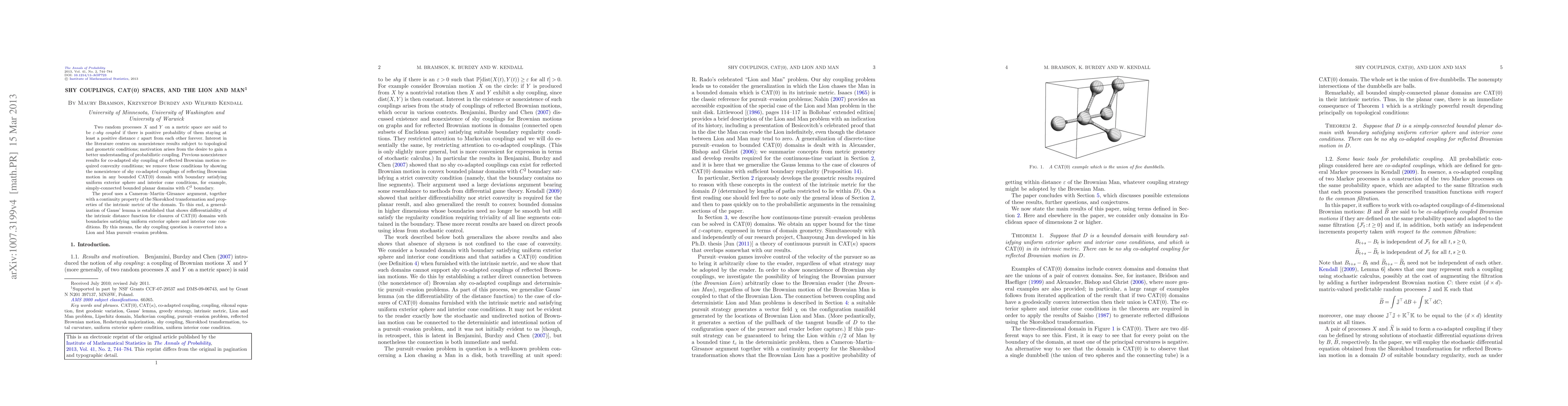 Two random processes X and Y on a metric space are said to be $\varepsilon$-shy coupled if there is positive probability of them staying at least a positive distance $\varepsilon$ apart from each other forever. Interest in the literature centres on nonexistence results subject to topological and geometric conditions; motivation arises from the desire to gain a better understanding of probabilistic coupling. Previous nonexistence results for co-adapted shy coupling of reflected Brownian motion required convexity conditions; we remove these conditions by showing the nonexistence of shy co-adapted couplings of reflecting Brownian motion in any bounded CAT(0) domain with boundary satisfying uniform exterior sphere and interior cone conditions, for example, simply-connected bounded planar domains with $C^2$ boundary. The proof uses a Cameron-Martin-Girsanov argument, together with a continuity property of the Skorokhod transformation and properties of the intrinsic metric of the domain. To this end, a generalization of Gauss' lemma is established that shows differentiability of the intrinsic distance function for closures of CAT(0) domains with boundaries satisfying uniform exterior sphere and interior cone conditions. By this means, the shy coupling question is converted into a Lion and Man pursuit-evasion problem.