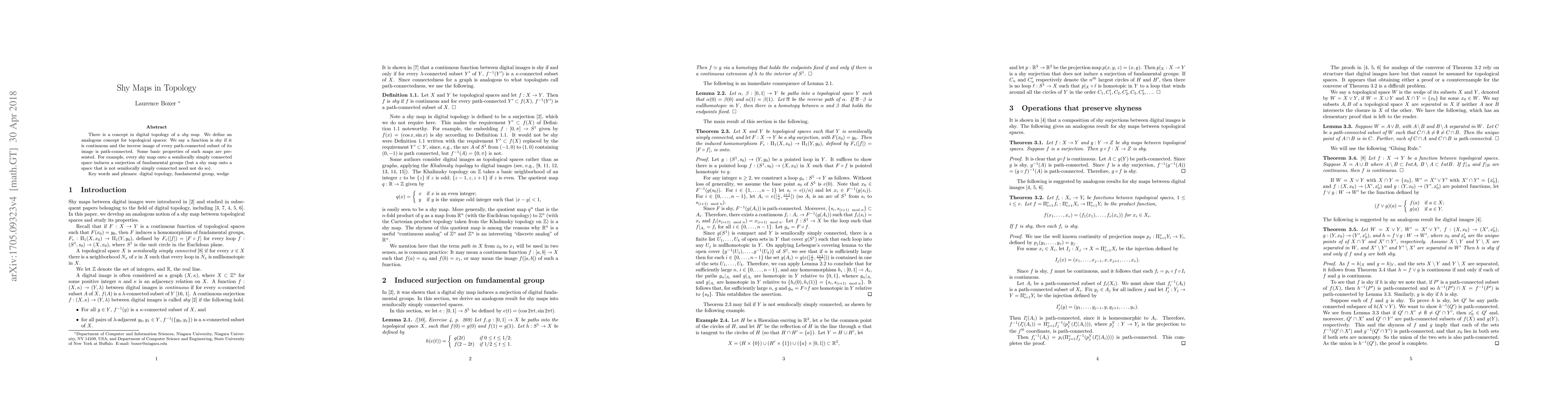 This paper introduces the concept of shy maps in topology, where a function is shy if it is continuous and the preimage of every path-connected subset of its image is path-connected. The study explores basic properties of shy maps, including their behavior in inducing surjections of fundamental groups when mapping to semilocally simply connected spaces.