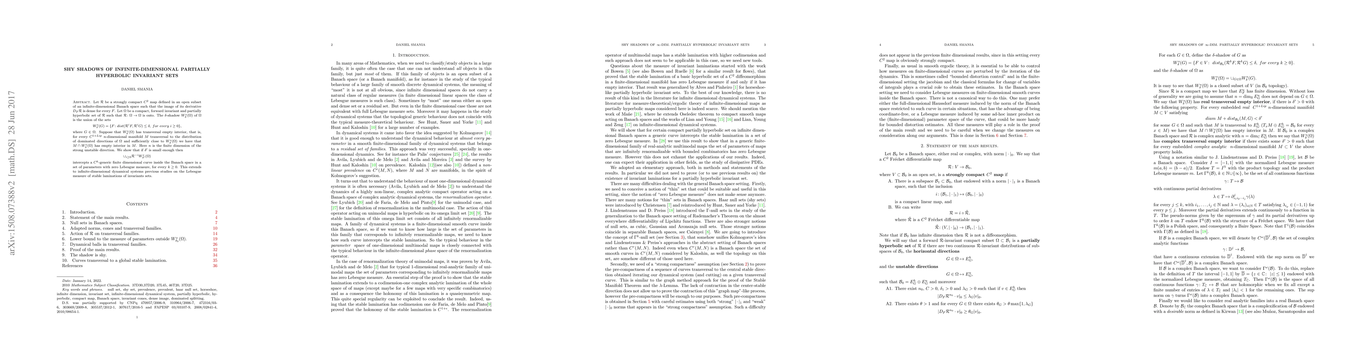 Let $\mathcal{R}$ be a strongly compact $C^2$ map defined in an open subset of an infinite-dimensional Banach space such that the image of its derivative $D_F \mathcal{R}$ is dense for every $F$. Let $\Omega$ be a compact, forward invariant and partially hyperbolic set of $\mathcal{R}$ such that $\mathcal{R}\colon \Omega\rightarrow \Omega$ is onto. The $\delta$-shadow $W^s_\delta(\Omega)$ of $\Omega$ is the union of the sets $$W^s_\delta(G)= \{F\colon dist(\mathcal{R}^iF, \mathcal{R}^iG) \leq \delta, \ for \ every \ i\geq 0 \},$$ where $G \in \Omega$. Suppose that $W^s_\delta(\Omega)$ has transversal empty interior, that is, for every $C^{1+Lip}$ $n$-dimensional manifold $M$ transversal to the distribution of dominated directions of $\Omega$ and sufficiently close to $W^s_\delta(\Omega)$ we have that $M\cap W^s_\delta(\Omega)$ has empty interior in $M$. Here $n$ is the finite dimension of the strong unstable direction. We show that if $\delta'$ is small enough then $$\cup_{i\geq 0}\mathcal{R}^{-i}W^s_{\delta'} (\Omega)$$ intercepts a $C^k$-generic finite dimensional curve inside the Banach space in a set of parameters with zero Lebesgue measure, for every $k\geq 0$. This extends to infinite-dimensional dynamical systems previous studies on the Lebesgue measure of stable laminations of invariants sets.