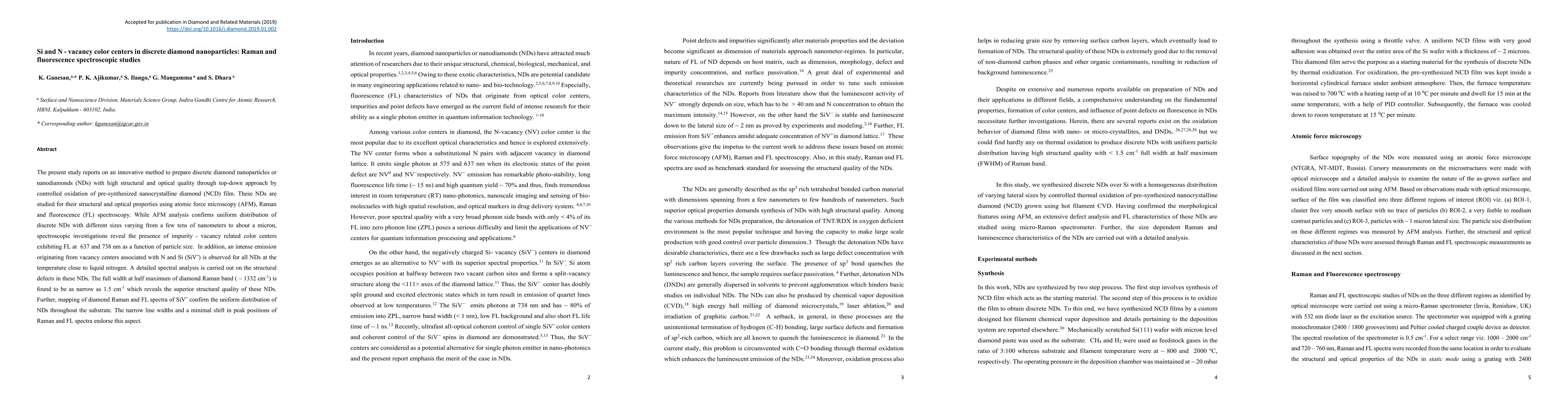 The present study reports on an innovative method to prepare discrete diamond nanoparticles or nanodiamonds (NDs) with high structural and optical quality through top-down approach by controlled oxidation of pre-synthesized nanocrystalline diamond (NCD) film. These NDs are studied for their structural and optical properties using atomic force microscopy (AFM), Raman and fluorescence (FL) spectroscopy. While AFM analysis confirms uniform distribution of discrete NDs with different sizes varying from a few tens of nanometers to about a micron, spectroscopic investigations reveal the presence of impurity - vacancy related color centers exhibiting FL at 637 and 738 nm as a function of particle size. In addition, an intense emission originating from vacancy centers associated with N and Si (SiV-) is observed for all NDs at the temperature close to liquid nitrogen. A detailed spectral analysis is carried out on the structural defects in these NDs. The full width at half maximum of diamond Raman band ( ~ 1332 cm-1) is found to be as narrow as 1.5 cm-1 which reveals the superior structural quality of these NDs. Further, mapping of diamond Raman and FL spectra of SiV- confirm the uniform distribution of NDs throughout the substrate. The narrow line widths and a minimal shift in peak positions of Raman and FL spectra endorse this aspect.
