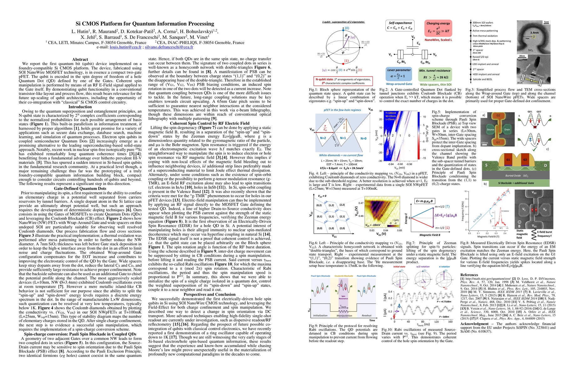 This paper presents a quantum bit device implemented on a foundry-compatible Si CMOS platform using SOI NanoWire MOSFET technology, encoding the qubit in a hole Quantum Dot's spin degree of freedom and manipulating it via RF E-Field signals.
