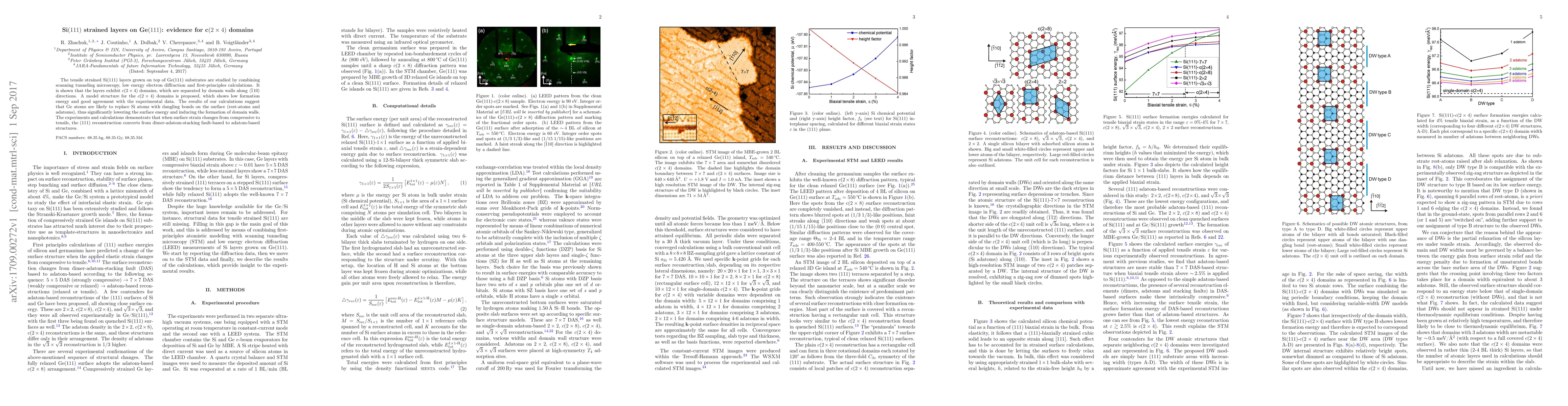 This paper investigates tensile strained Si(111) layers on Ge(111) substrates, revealing c(2x4) domain formation via scanning tunneling microscopy and low energy electron diffraction, supported by first-principles calculations. The study proposes a low-energy model for these domains and shows that Ge atoms replacing Si atoms lowers surface energy, inducing domain wall formation.