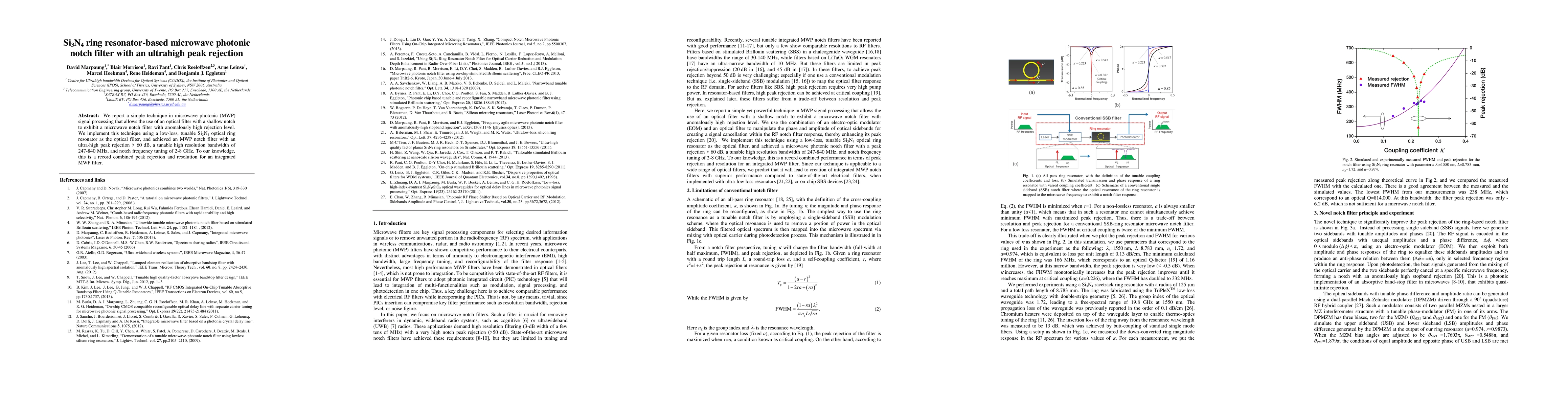 This research presents a novel technique for creating a microwave photonic notch filter using a low-loss Si3N4 optical ring resonator, achieving ultrahigh peak rejection over 60 dB and tunable bandwidth from 247 to 840 MHz, setting a new record for integrated microwave photonic filters.
