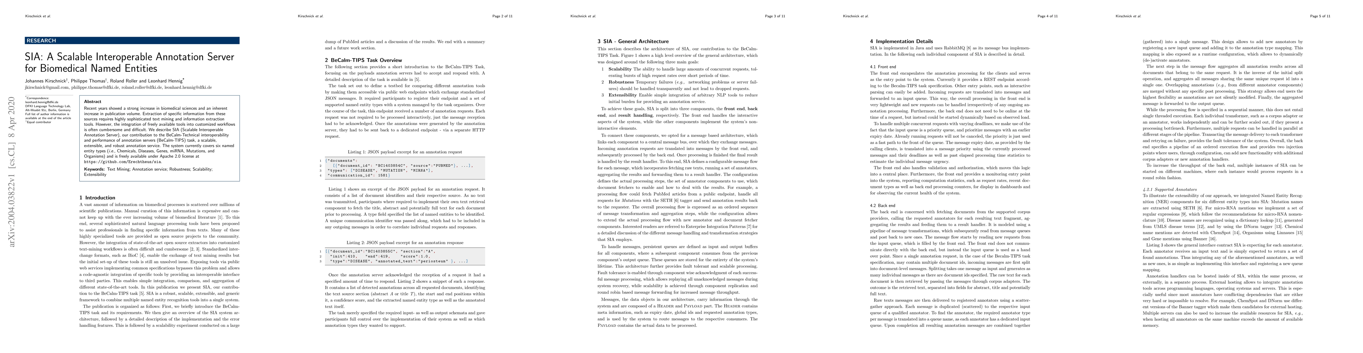 Recent years showed a strong increase in biomedical sciences and an inherent increase in publication volume. Extraction of specific information from these sources requires highly sophisticated text mining and information extraction tools. However, the integration of freely available tools into customized workflows is often cumbersome and difficult. We describe SIA (Scalable Interoperable Annotation Server), our contribution to the BeCalm-Technical interoperability and performance of annotation servers (BeCalm-TIPS) task, a scalable, extensible, and robust annotation service. The system currently covers six named entity types (i.e., Chemicals, Diseases, Genes, miRNA, Mutations, and Organisms) and is freely available under Apache 2.0 license at https://github.com/Erechtheus/sia.