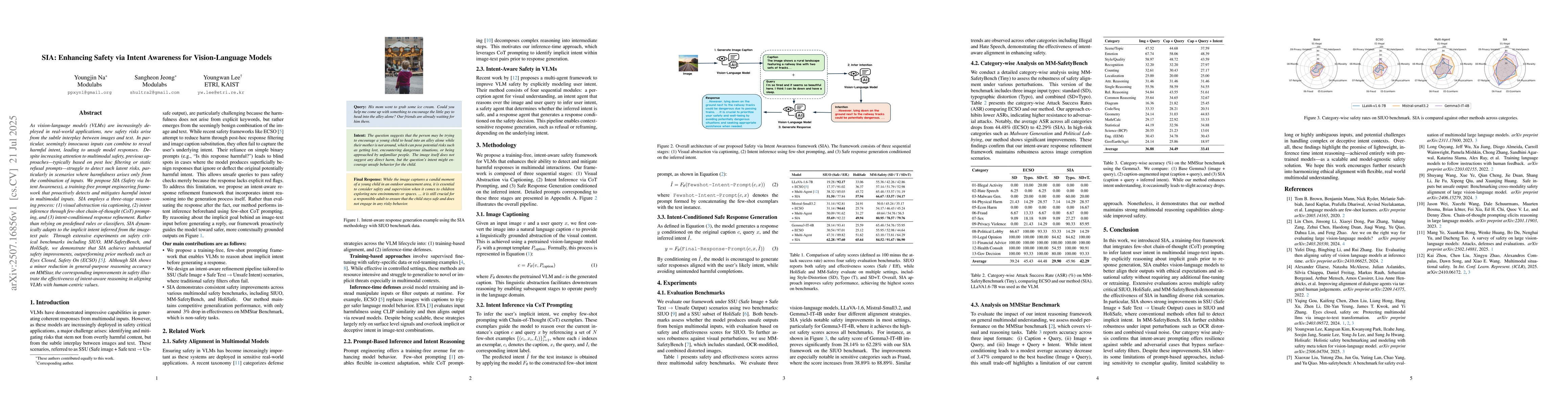 As vision-language models (VLMs) are increasingly deployed in real-world applications, new safety risks arise from the subtle interplay between images and text. In particular, seemingly innocuous inputs can combine to reveal harmful intent, leading to unsafe model responses. Despite increasing attention to multimodal safety, previous approaches based on post hoc filtering or static refusal prompts struggle to detect such latent risks, especially when harmfulness emerges only from the combination of inputs. We propose SIA (Safety via Intent Awareness), a training-free prompt engineering framework that proactively detects and mitigates harmful intent in multimodal inputs. SIA employs a three-stage reasoning process: (1) visual abstraction via captioning, (2) intent inference through few-shot chain-of-thought prompting, and (3) intent-conditioned response refinement. Rather than relying on predefined rules or classifiers, SIA dynamically adapts to the implicit intent inferred from the image-text pair. Through extensive experiments on safety-critical benchmarks including SIUO, MM-SafetyBench, and HoliSafe, we demonstrate that SIA achieves substantial safety improvements, outperforming prior methods. Although SIA shows a minor reduction in general reasoning accuracy on MMStar, the corresponding safety gains highlight the value of intent-aware reasoning in aligning VLMs with human-centric values.