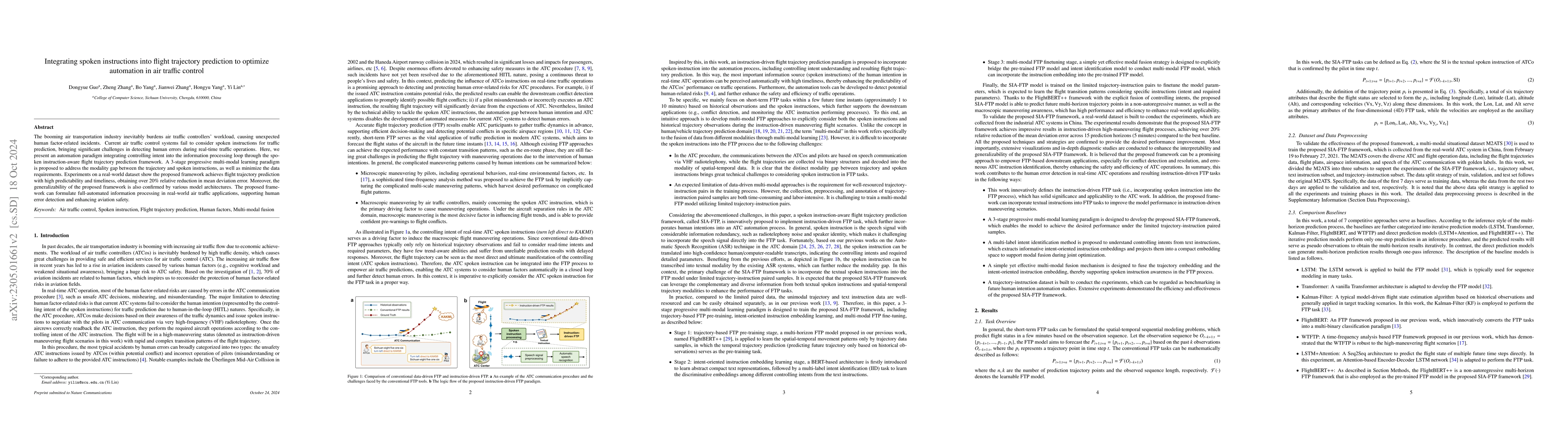 The SIA-FTP framework proposes a novel approach to enhance flight trajectory prediction by incorporating real-time spoken instructions, addressing the modality gap between spoken commands and flight data. The framework employs a 3-stage learning paradigm to progressively integrate spoken instructions into trajectory prediction, achieving significant performance improvements in high-maneuvering scenarios.