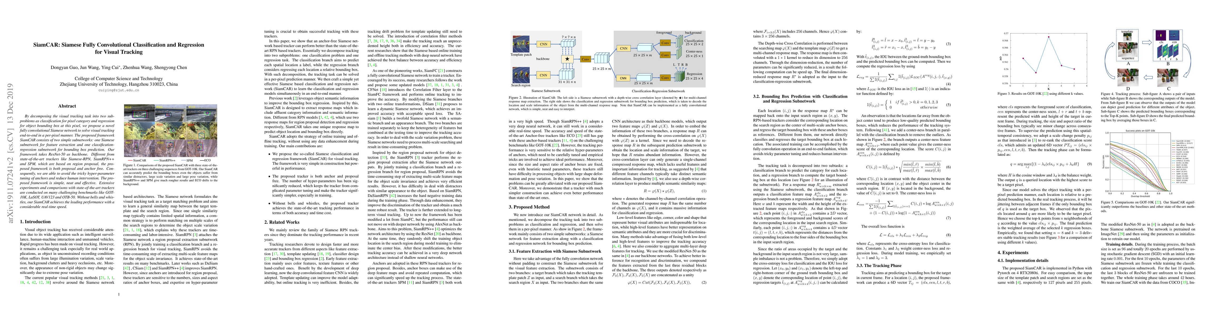 The paper introduces SiamCAR, a fully convolutional Siamese network for visual tracking that decomposes the task into classification and regression, achieving state-of-the-art performance without region proposals or anchor tuning, and demonstrating leading results on multiple benchmarks.