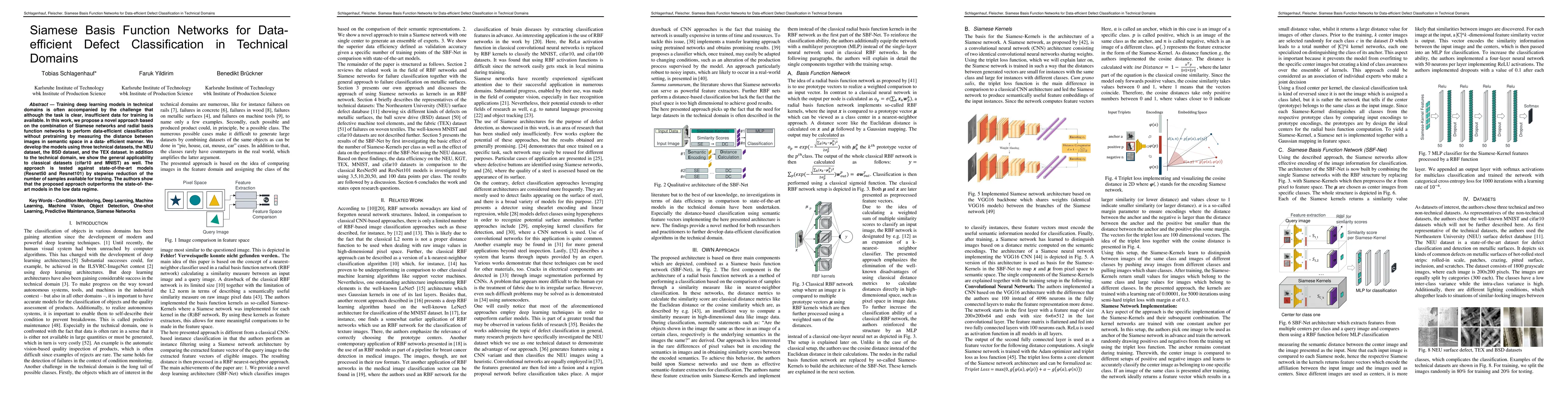 This paper proposes a novel Siamese Basis Function Network for data-efficient defect classification in technical domains, combining Siamese networks with radial basis functions to measure image distances in semantic space. The approach outperforms state-of-the-art models like Resnet50 and Resnet101 in low data regimes, demonstrated across technical and classical datasets.