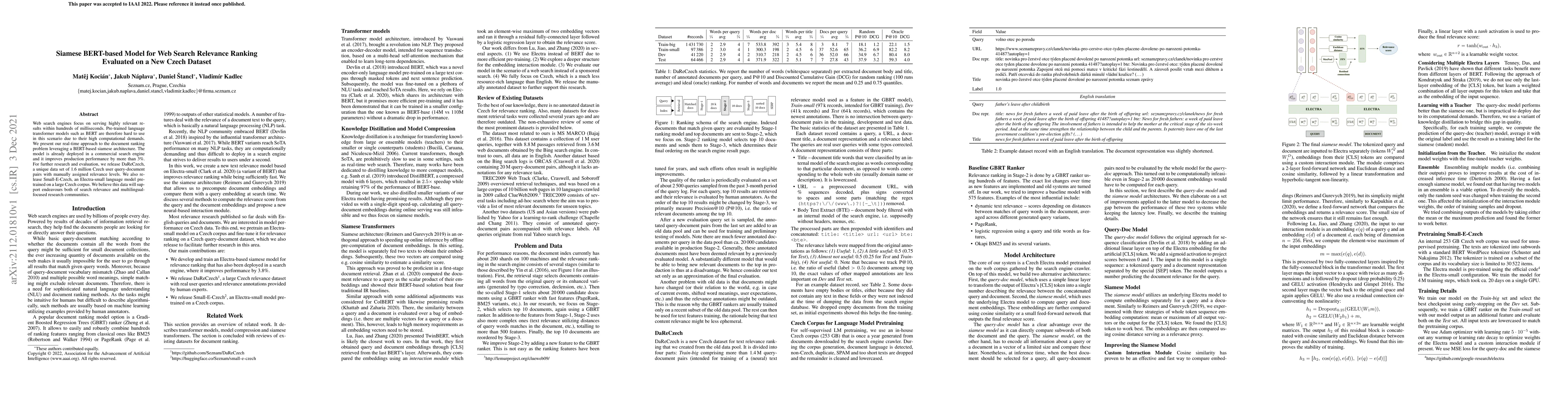 This paper introduces a BERT-based Siamese model for real-time web search relevance ranking, which outperforms traditional methods by over 3%. To facilitate further research, the authors release DaReCzech, a dataset of 1.6 million Czech query-document relevance pairs, and Small-E-Czech, a pre-trained Electra-small language model for Czech.