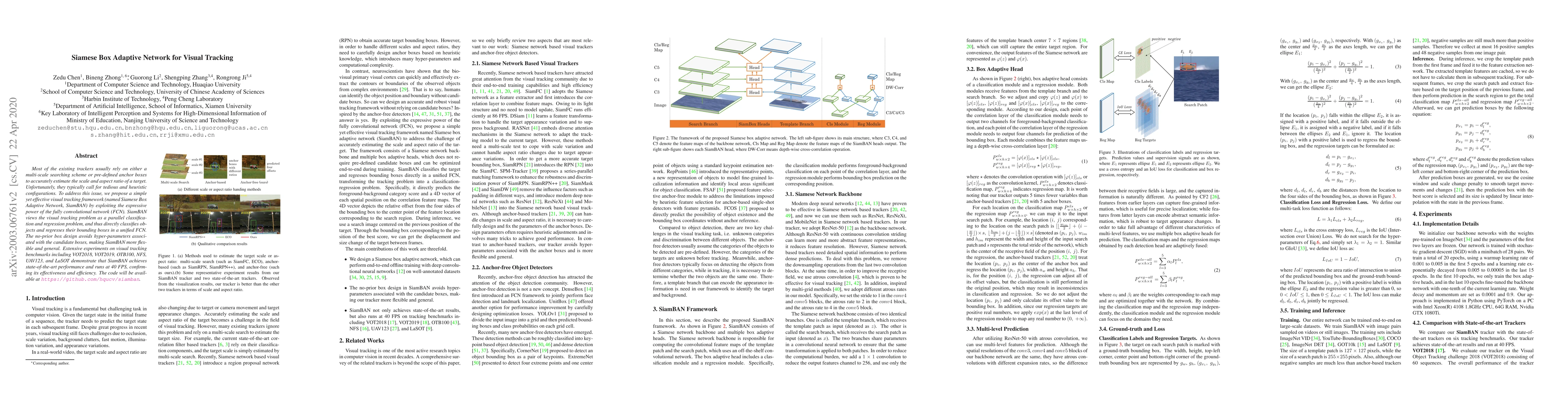 The Siamese Box Adaptive Network (SiamBAN) proposes a novel visual tracking framework that leverages a fully convolutional network for parallel classification and regression, eliminating the need for predefined anchor boxes and thus reducing hyperparameters. SiamBAN achieves state-of-the-art performance on multiple tracking benchmarks while maintaining high efficiency at 40 FPS.