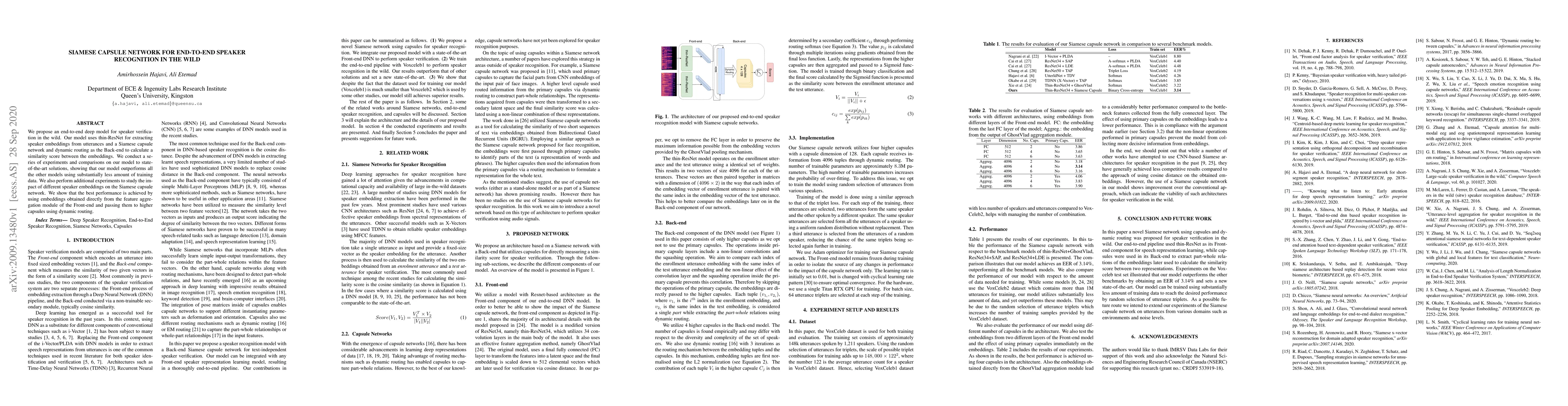 This paper proposes an end-to-end Siamese capsule network for speaker verification that uses thin-ResNet for embedding extraction and outperforms state-of-the-art models with less training data. Best results are achieved when using embeddings from the feature aggregation module processed via dynamic routing.