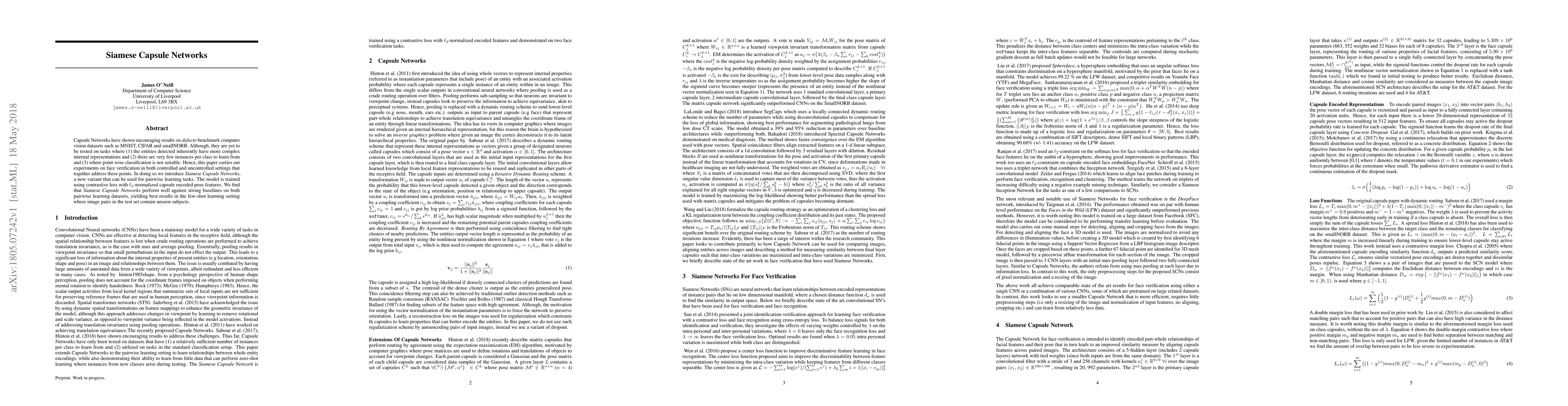 The paper proposes Siamese Capsule Networks for face verification tasks, showing promising results in few-shot learning scenarios. The model outperforms baselines by utilizing contrastive loss and $\ell_2$-normalized pose features from capsule encodings.