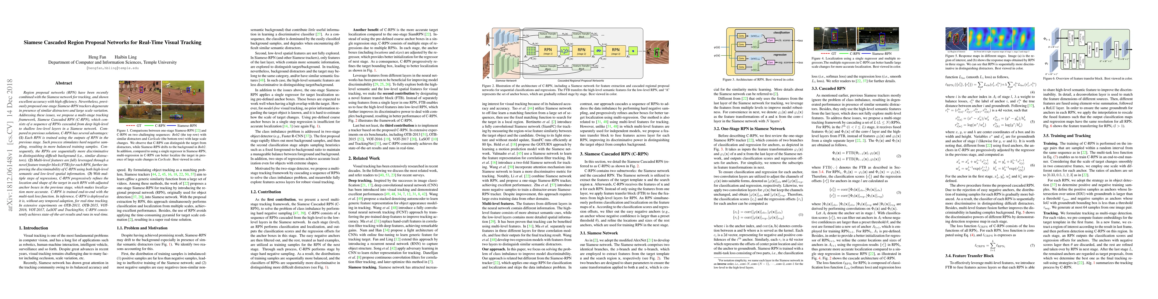 The paper proposes a Siamese Cascaded Region Proposal Network (C-RPN) for real-time visual tracking, which employs a multi-stage framework with sequential RPNs to progressively refine target localization and improve discriminability against distractors and scale variations. C-RPN achieves state-of-the-art performance across multiple benchmarks.