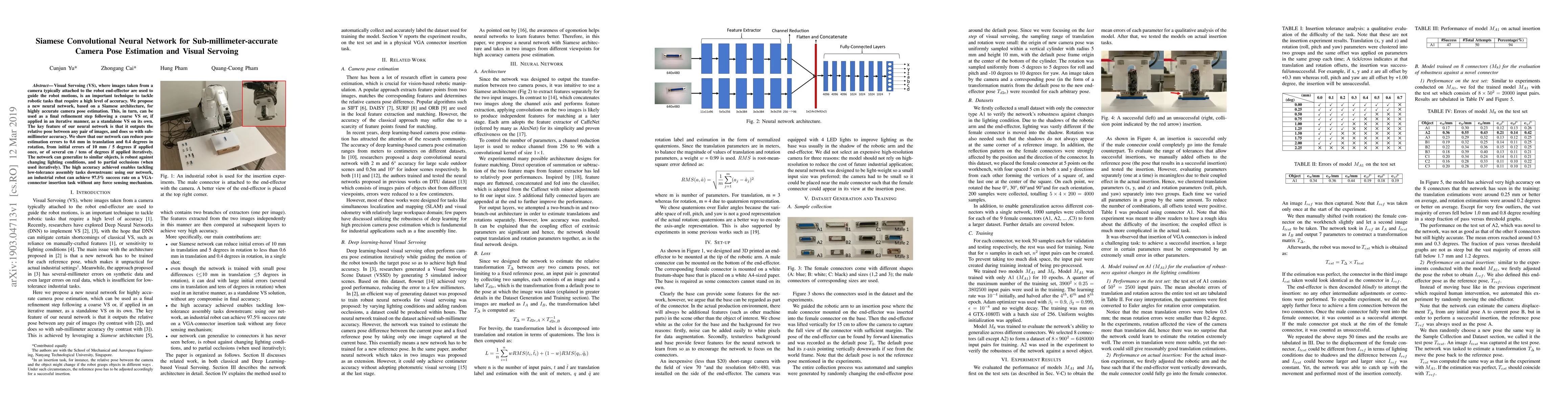 Researchers propose a Siamese convolutional neural network for accurate camera pose estimation with sub-millimeter accuracy, enabling precise robotic tasks like assembly and visual servoing.