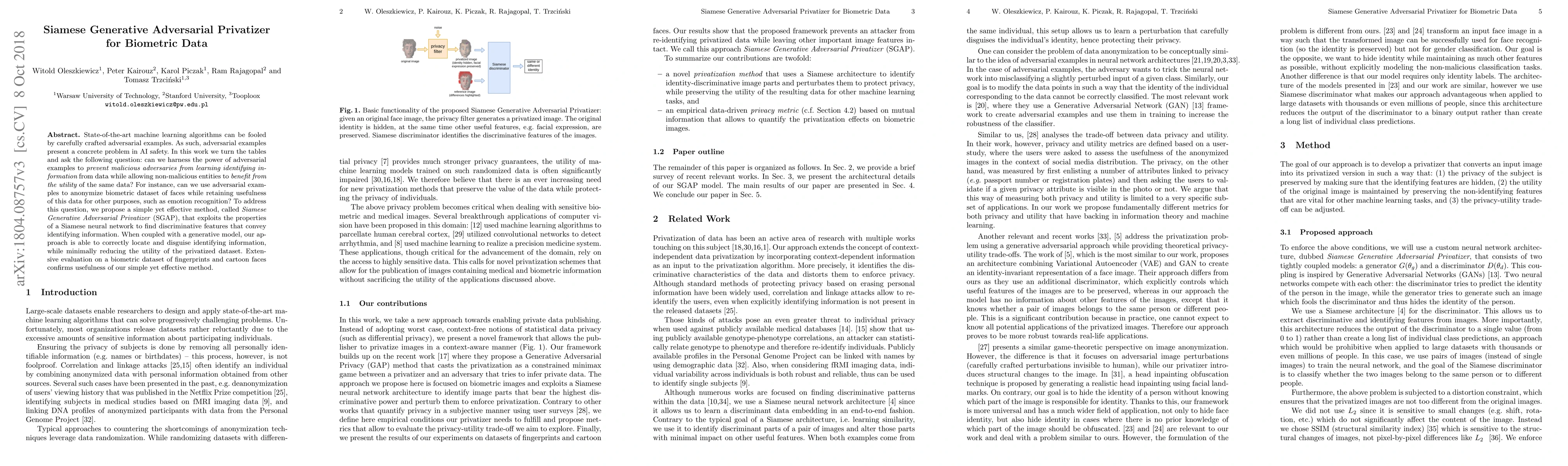 Researchers propose a method called Siamese Generative Adversarial Privatizer (SGAP) to protect biometric data from malicious use while allowing non-malicious entities to retain its usefulness.