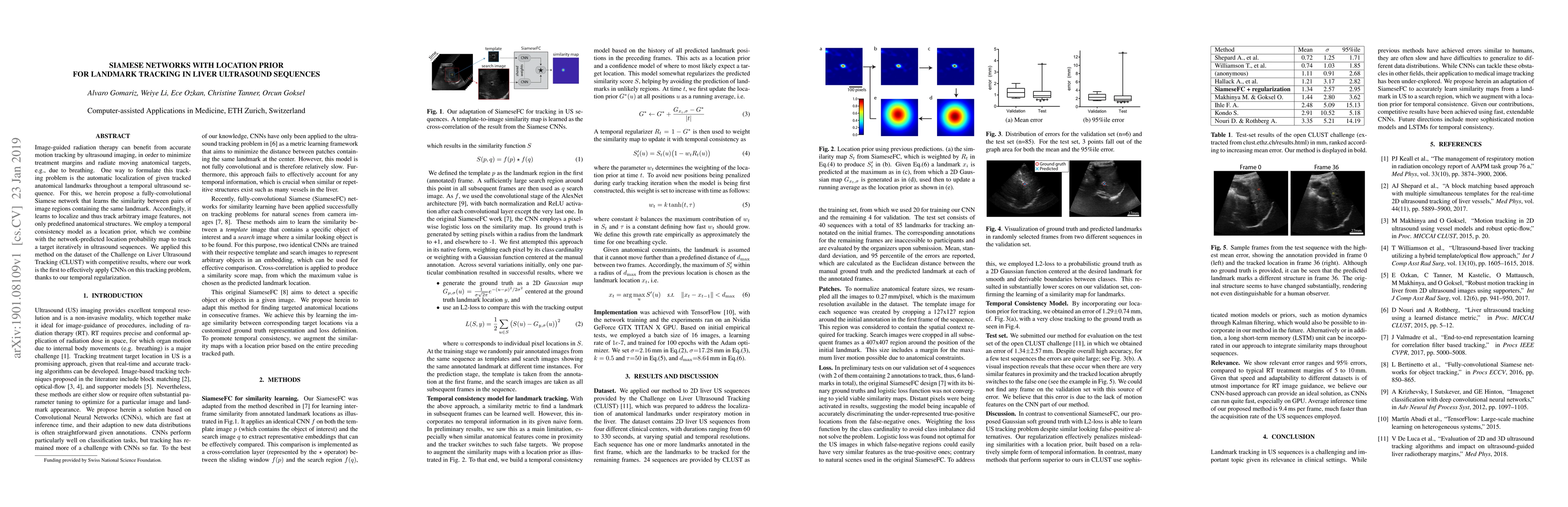 This paper proposes a fully-convolutional Siamese network for tracking landmarks in liver ultrasound sequences, utilizing a temporal consistency model as a location prior to enhance tracking accuracy. The method achieves competitive results on the Challenge on Liver Ultrasound Tracking (CLUST) dataset, marking the first effective application of CNNs for this tracking problem.