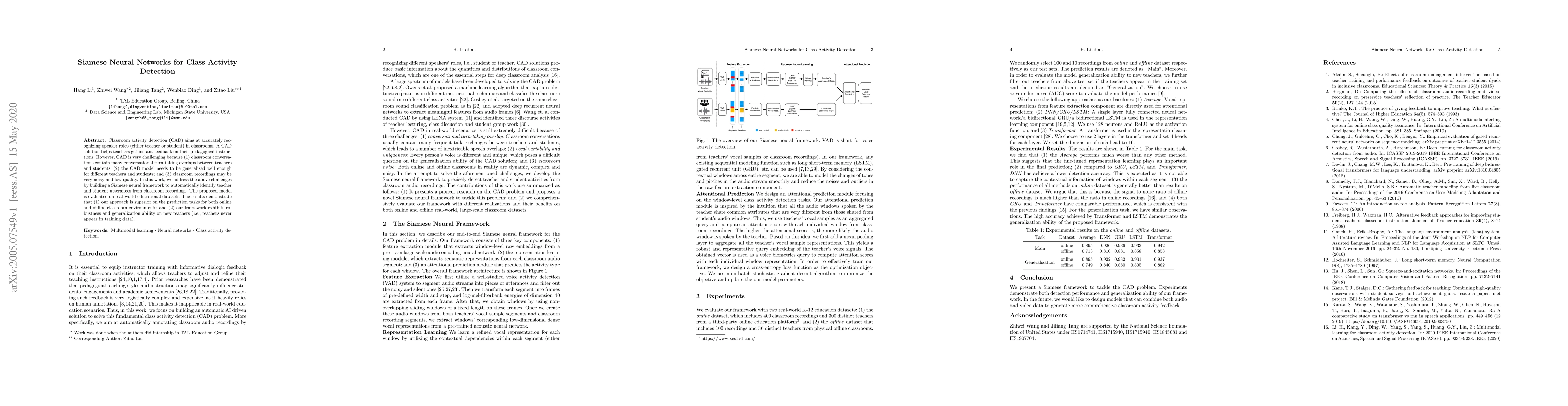 Classroom activity detection (CAD) aims at accurately recognizing speaker roles (either teacher or student) in classrooms. A CAD solution helps teachers get instant feedback on their pedagogical instructions. However, CAD is very challenging because (1) classroom conversations contain many conversational turn-taking overlaps between teachers and students; (2) the CAD model needs to be generalized well enough for different teachers and students; and (3) classroom recordings may be very noisy and low-quality. In this work, we address the above challenges by building a Siamese neural framework to automatically identify teacher and student utterances from classroom recordings. The proposed model is evaluated on real-world educational datasets. The results demonstrate that (1) our approach is superior on the prediction tasks for both online and offline classroom environments; and (2) our framework exhibits robustness and generalization ability on new teachers (i.e., teachers never appear in training data).