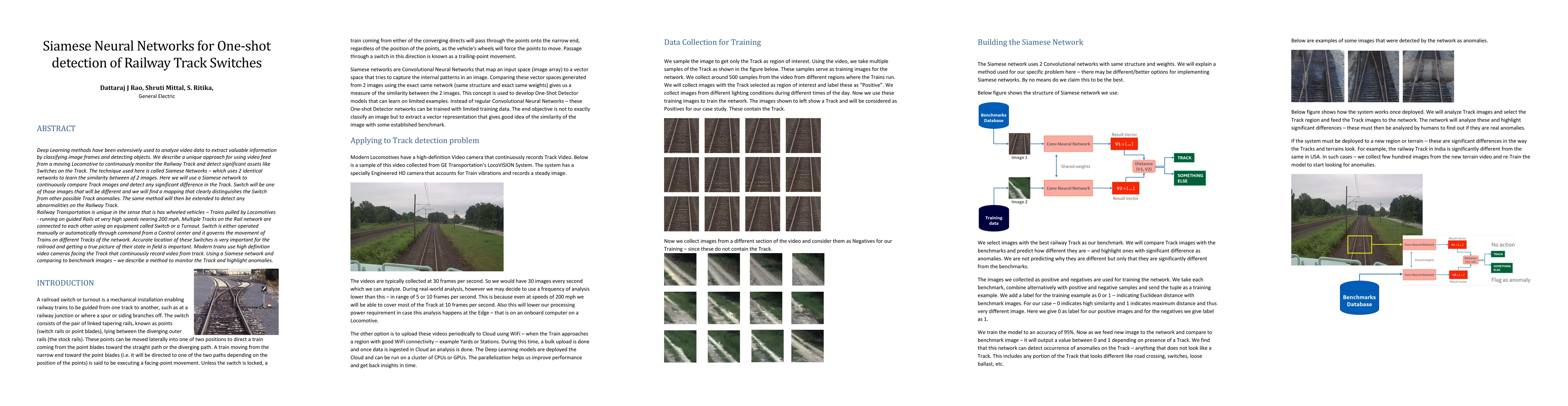 Deep Learning methods have been extensively used to analyze video data to extract valuable information by classifying image frames and detecting objects. We describe a unique approach for using video feed from a moving Locomotive to continuously monitor the Railway Track and detect significant assets like Switches on the Track. The technique used here is called Siamese Networks, which uses 2 identical networks to learn the similarity between of 2 images. Here we will use a Siamese network to continuously compare Track images and detect any significant difference in the Track. Switch will be one of those images that will be different and we will find a mapping that clearly distinguishes the Switch from other possible Track anomalies. The same method will then be extended to detect any abnormalities on the Railway Track. Railway Transportation is unique in the sense that is has wheeled vehicles, Trains pulled by Locomotives, running on guided Rails at very high speeds nearing 200 mph. Multiple Tracks on the Rail network are connected to each other using an equipment called Switch or a Turnout. Switch is either operated manually or automatically through command from a Control center and it governs the movement of Trains on different Tracks of the network. Accurate location of these Switches is very important for the railroad and getting a true picture of their state in field is important. Modern trains use high definition video cameras facing the Track that continuously record video from track. Using a Siamese network and comparing to benchmark images, we describe a method to monitor the Track and highlight anomalies.