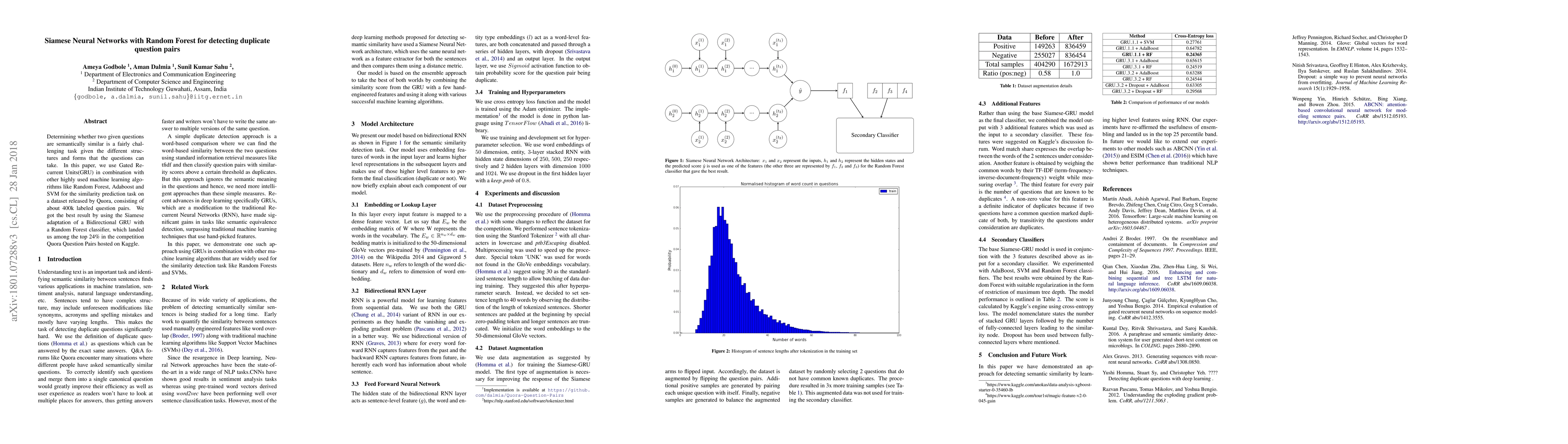 This paper explores the use of a Siamese neural network with a Bidirectional GRU combined with a Random Forest classifier for detecting semantically similar question pairs. The approach achieved top 24% results in the Quora Question Pairs competition, outperforming other machine learning algorithms like Adaboost and SVM.