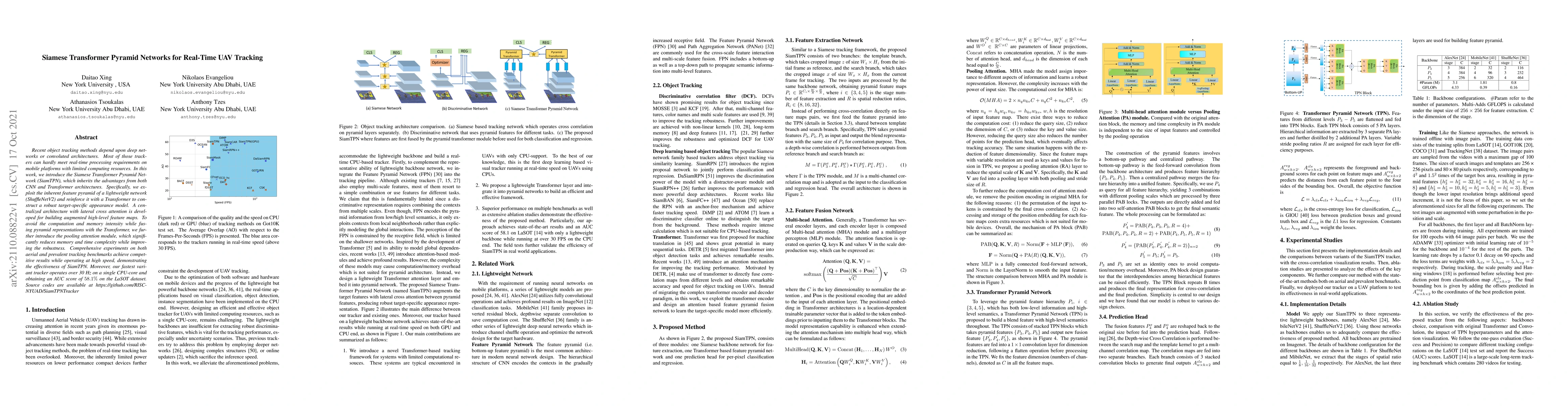 The paper proposes the Siamese Transformer Pyramid Network (SiamTPN) for real-time UAV tracking, combining CNN and Transformer architectures to enhance feature extraction and tracking efficiency. The method achieves high-speed performance on limited computing resources while maintaining competitive tracking accuracy.