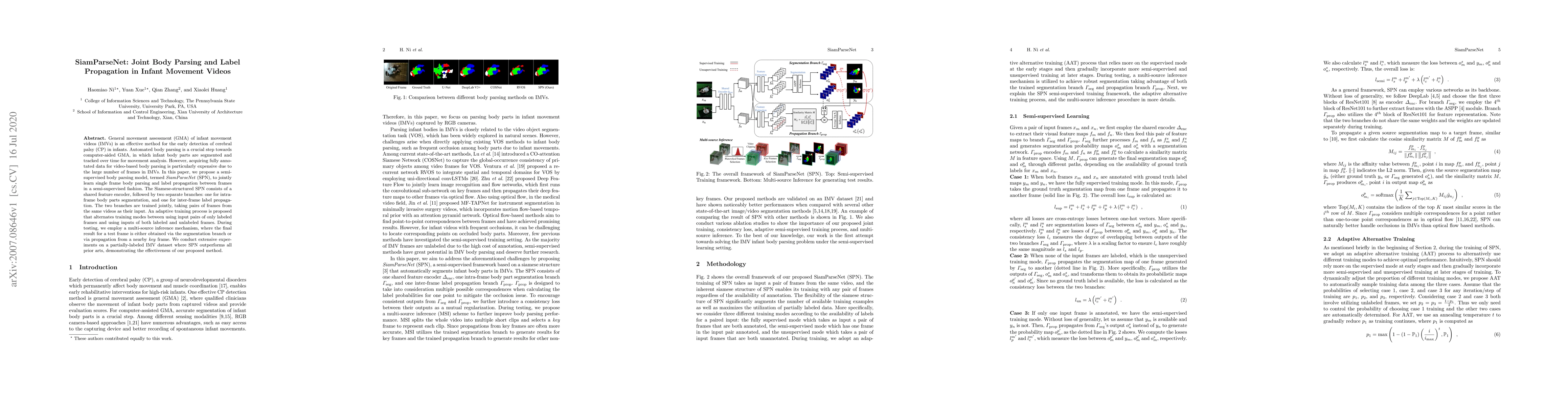 SiamParseNet proposes a semi-supervised model for joint body parsing and label propagation in infant movement videos, enabling effective early detection of cerebral palsy. The model alternates between training on labeled and unlabeled frames, achieving superior performance with a multi-source inference mechanism.