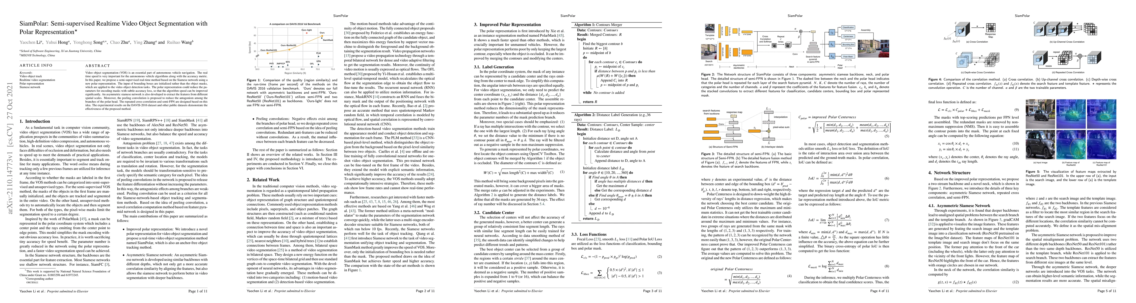 The paper proposes a semi-supervised real-time video object segmentation method using a polar representation and Siamese network, which significantly improves speed while maintaining accuracy. The method leverages bounding boxes for initialization and employs an asymmetric Siamese network and peeling convolution to enhance feature extraction and reduce computational load.
