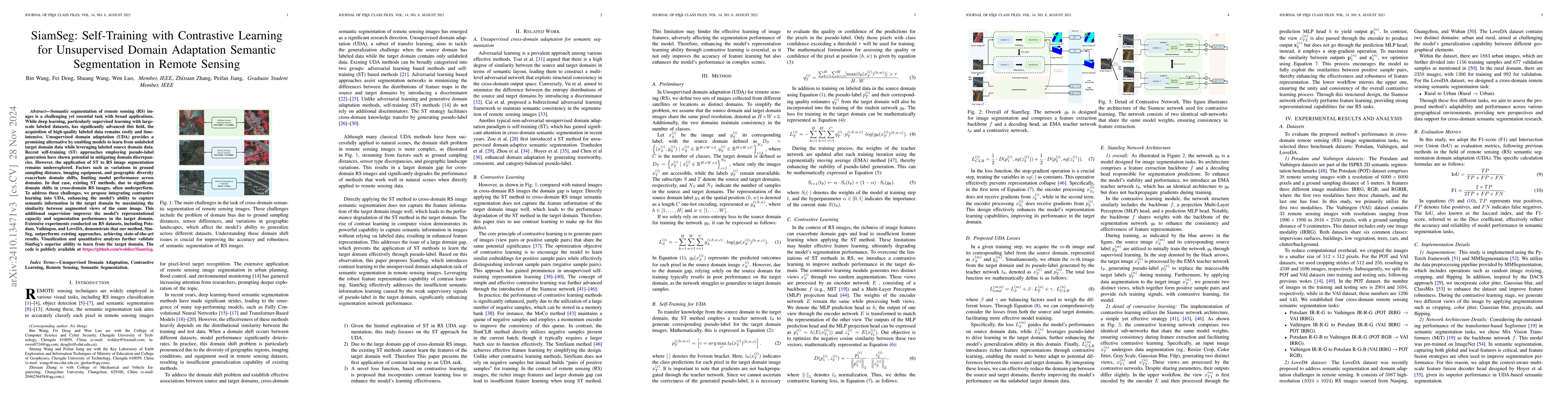 SiamSeg introduces a self-training method leveraging contrastive learning for unsupervised domain adaptation in remote sensing image semantic segmentation, aiming to improve model performance across different domains despite the lack of labeled target domain data. This approach utilizes pseudo-labeling to bridge the domain gap and enhance cross-domain generalization.