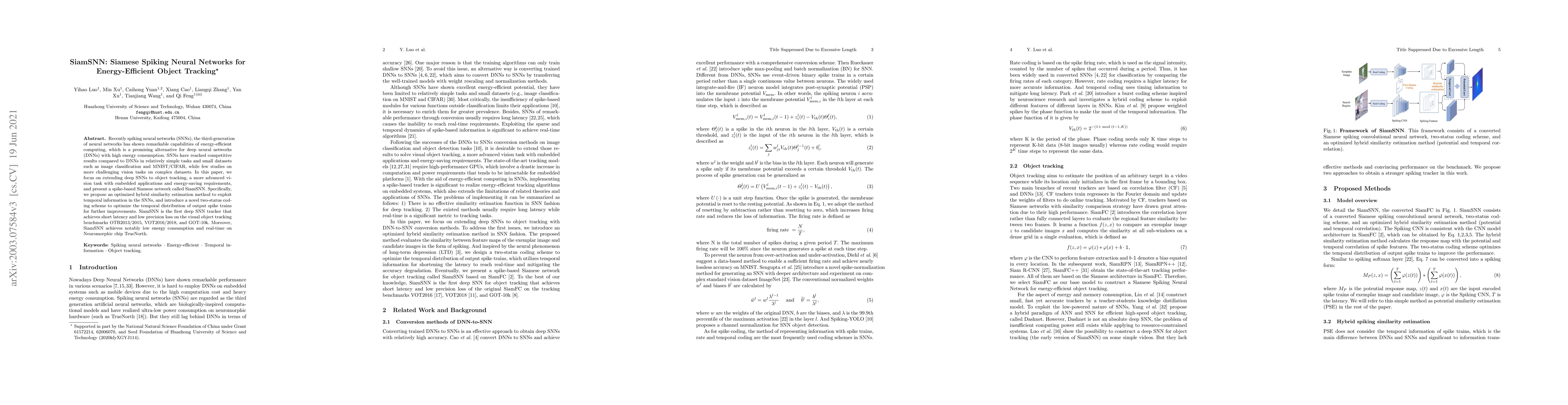 This paper introduces SiamSNN, a spiking neural network for energy-efficient object tracking, achieving competitive performance on benchmarks while maintaining low latency and energy consumption on the TrueNorth neuromorphic chip. The approach combines a hybrid similarity estimation method and a two-status coding scheme for optimized temporal spike train distribution.