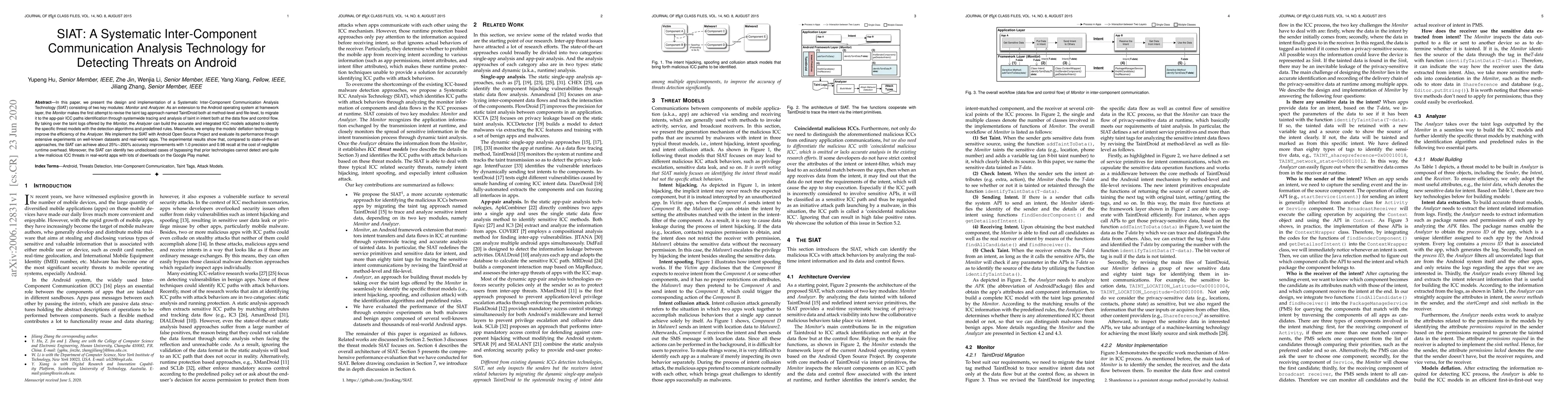 The paper introduces SIAT, a technology for detecting threats in Android through inter-component communication analysis, featuring a Monitor module for tracing and an Analyzer module for threat identification. Experimental results show significant accuracy improvements and the ability to detect undisclosed threats.