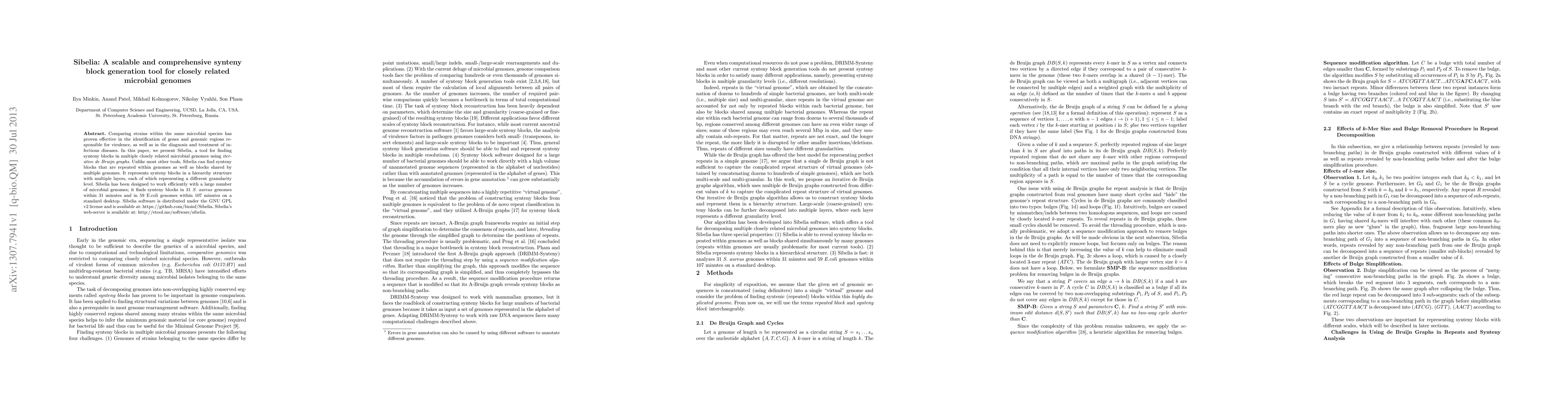 Sibelia is an efficient tool for generating synteny blocks in closely related microbial genomes using iterative de Bruijn graphs, capable of identifying repeated and shared blocks across multiple genomes. It operates at various granularity levels and scales well to large datasets, demonstrated by its rapid performance on numerous S. aureus and E. coli genomes.