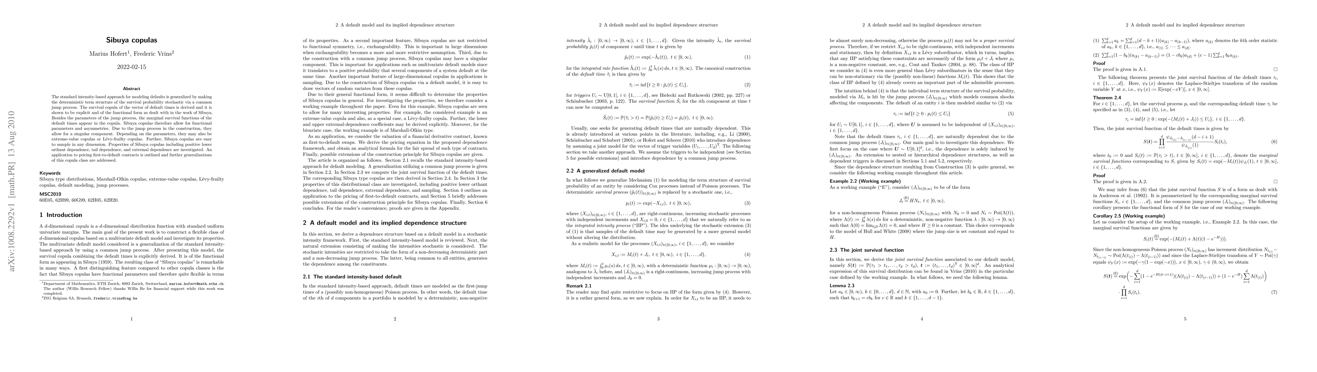 The standard intensity-based approach for modeling defaults is generalized by making the deterministic term structure of the survival probability stochastic via a common jump process. The survival copula of the vector of default times is derived and it is shown to be explicit and of the functional form as dealt with in the work of Sibuya. Besides the parameters of the jump process, the marginal survival functions of the default times appear in the copula. Sibuya copulas therefore allow for functional parameters and asymmetries. Due to the jump process in the construction, they allow for a singular component. Depending on the parameters, they may also be extreme-value copulas or Levy-frailty copulas. Further, Sibuya copulas are easy to sample in any dimension. Properties of Sibuya copulas including positive lower orthant dependence, tail dependence, and extremal dependence are investigated. An application to pricing first-to-default contracts is outlined and further generalizations of this copula class are addressed.