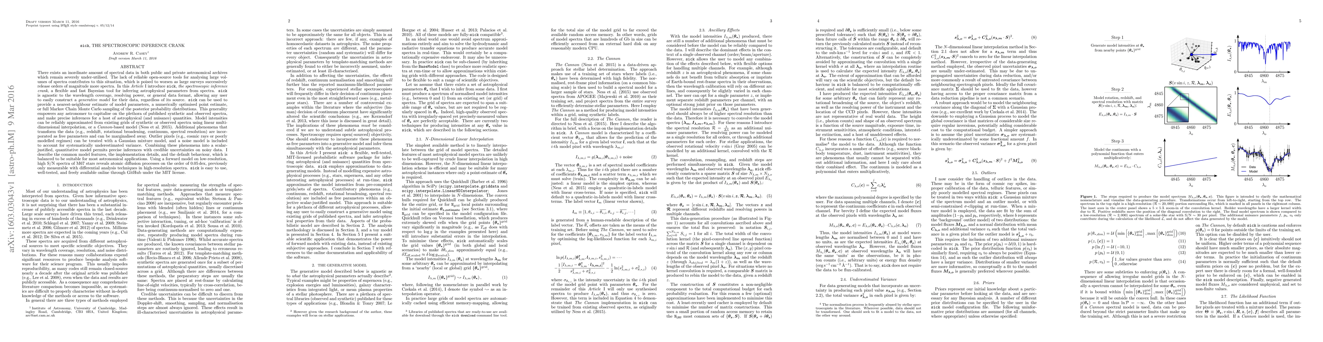 There exists an inordinate amount of spectral data in both public and private astronomical archives which remain severely under-utilised. The lack of reliable open-source tools for analysing large volumes of spectra contributes to this situation, which is poised to worsen as large surveys successively release orders of magnitude more spectra. In this Article I introduce sick, the spectroscopic inference crank, a flexible and fast Bayesian tool for inferring astrophysical parameters from spectra. sick can be used to provide a nearest-neighbour estimate of model parameters, a numerically optimised point estimate, or full Markov Chain Monte Carlo sampling of the posterior probability distributions. This generality empowers any astronomer to capitalise on the plethora of published synthetic and observed spectra, and make precise inferences for a host of astrophysical (and nuisance) quantities. Model intensities can be reliably approximated from existing grids of synthetic or observed spectra using linear multi-dimensional interpolation, or a Cannon-based model. Additional phenomena that transform the data (e.g., redshift, rotational broadening, continuum, spectral resolution) are incorporated as free parameters and can be marginalised away. Outlier pixels (e.g., cosmic rays or poorly modelled regimes) can be treated with a Gaussian mixture model, and a noise model is included to account for systematically underestimated variance. Combining these phenomena into a scalar-justified, quantitative model permits precise inferences with credible uncertainties on noisy data. Using a forward model on low-resolution, high S/N spectra of M67 stars reveals atomic diffusion processes on the order of 0.05 dex, previously only measurable with differential analysis techniques in high-resolution spectra. [abridged]