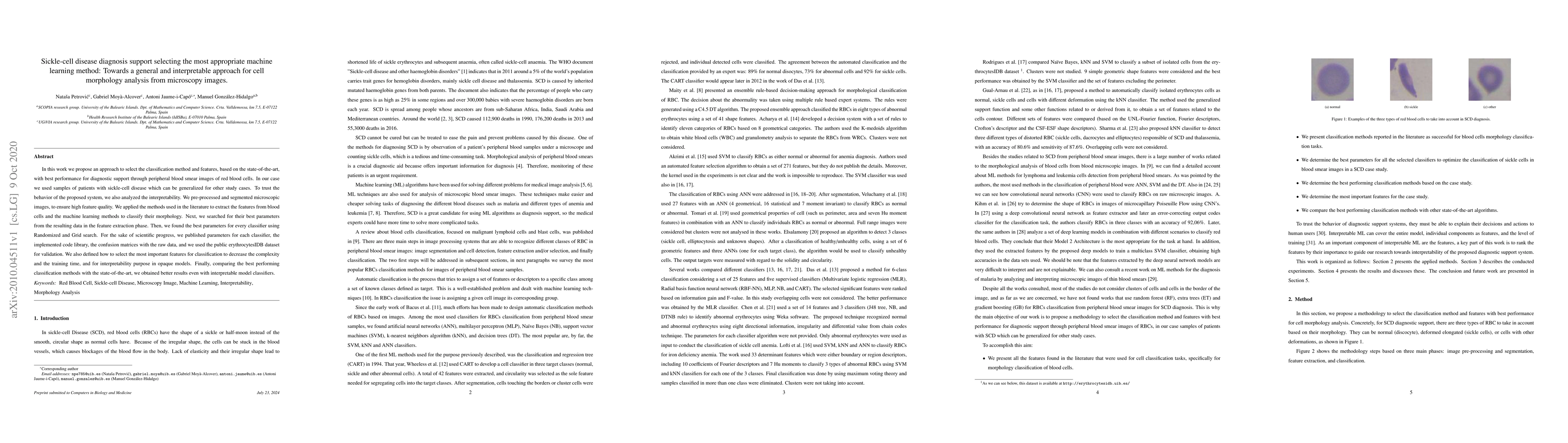 In this work we propose an approach to select the classification method and features, based on the state-of-the-art, with best performance for diagnostic support through peripheral blood smear images of red blood cells. In our case we used samples of patients with sickle-cell disease which can be generalized for other study cases. To trust the behavior of the proposed system, we also analyzed the interpretability. We pre-processed and segmented microscopic images, to ensure high feature quality. We applied the methods used in the literature to extract the features from blood cells and the machine learning methods to classify their morphology. Next, we searched for their best parameters from the resulting data in the feature extraction phase. Then, we found the best parameters for every classifier using Randomized and Grid search. For the sake of scientific progress, we published parameters for each classifier, the implemented code library, the confusion matrices with the raw data, and we used the public erythrocytesIDB dataset for validation. We also defined how to select the most important features for classification to decrease the complexity and the training time, and for interpretability purpose in opaque models. Finally, comparing the best performing classification methods with the state-of-the-art, we obtained better results even with interpretable model classifiers.