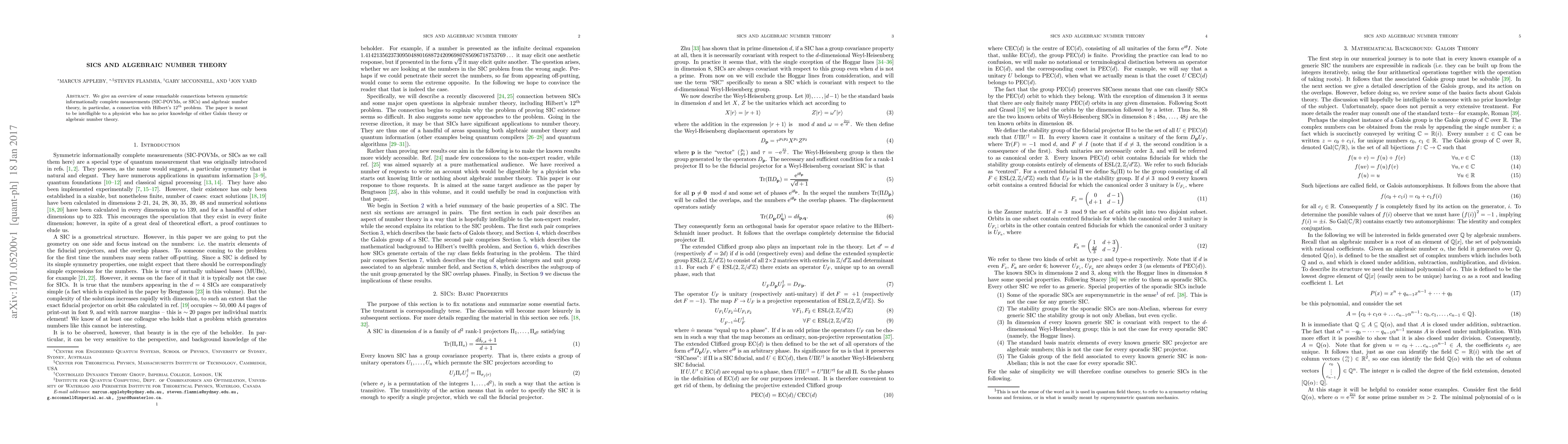 The research explores connections between symmetric informationally complete measurements (SIC-POVMs or SICs) and algebraic number theory, focusing on Hilbert's 12th problem, with the aim of being accessible to physicists unfamiliar with Galois theory or algebraic number theory.
