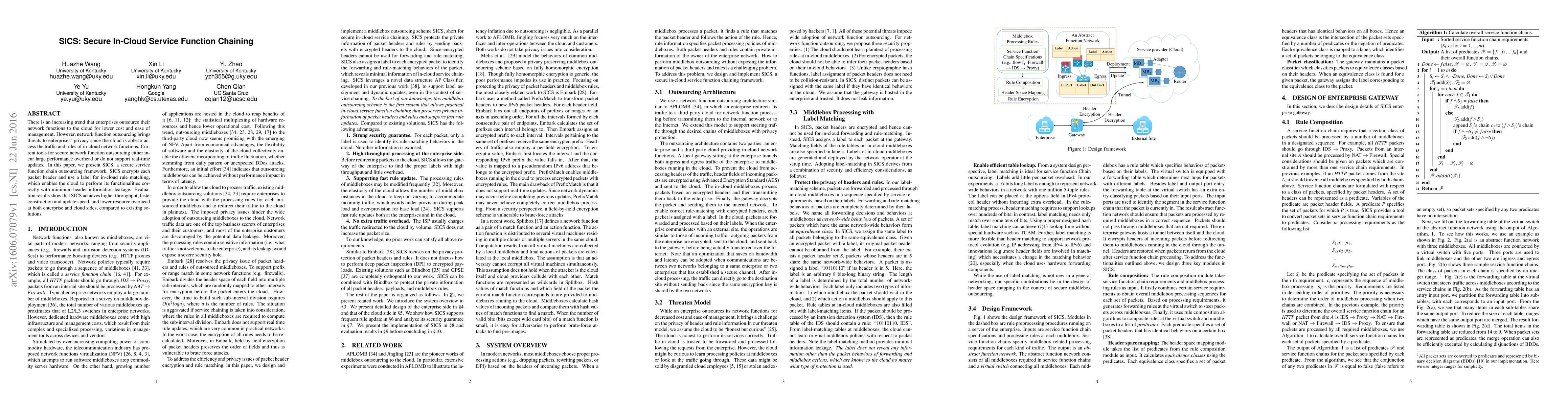 SICS proposes a secure cloud service function chaining framework that encrypts packet headers and uses labels for rule matching, achieving higher throughput, faster update speed, and lower resource overhead.
