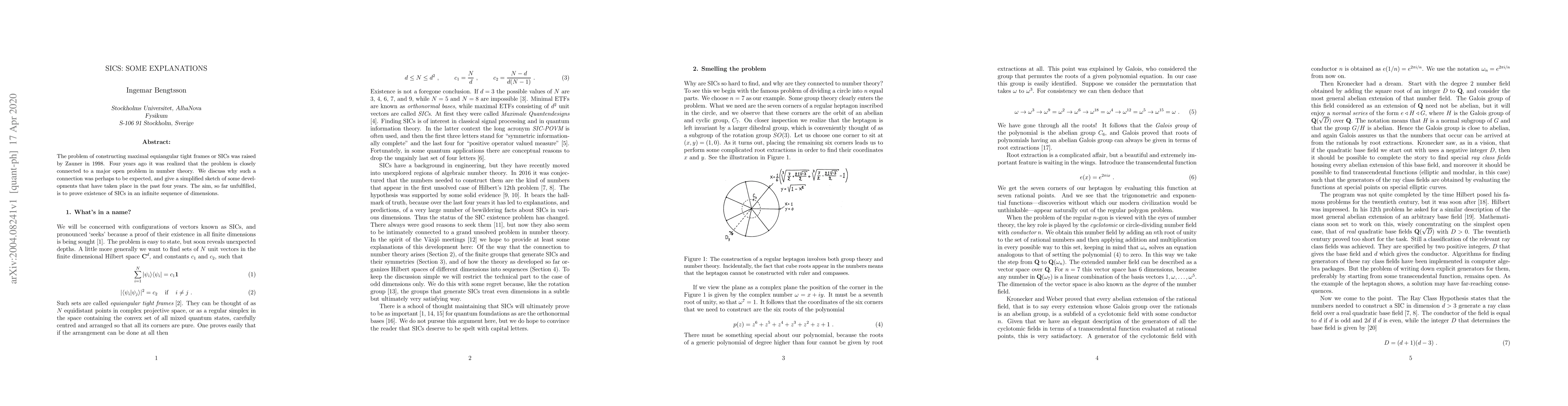 The paper discusses the unresolved problem of constructing maximal equiangular tight frames, or SICs, first posed by Zauner in 1998. It highlights the unexpected connection to a significant number theory issue from the past four years, aiming to prove the existence of SICs in infinite dimensions, but this goal remains unmet.