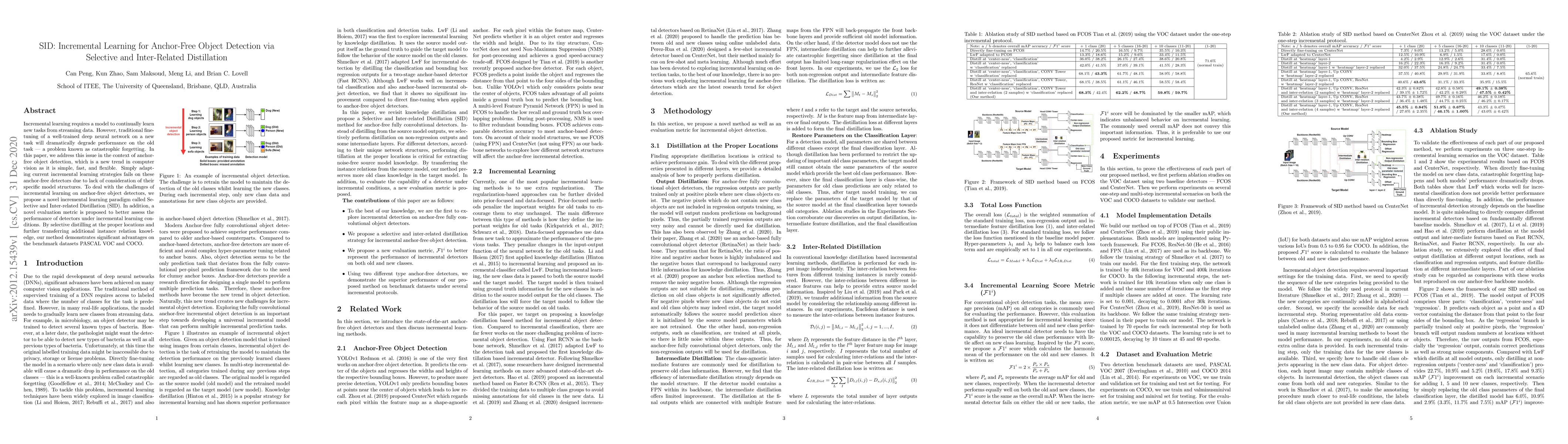 This paper proposes a novel incremental learning method called Selective and Inter-related Distillation (SID) to address catastrophic forgetting in anchor-free object detection. The method selectively distills knowledge and transfers instance relation information to improve performance on both new and old tasks.