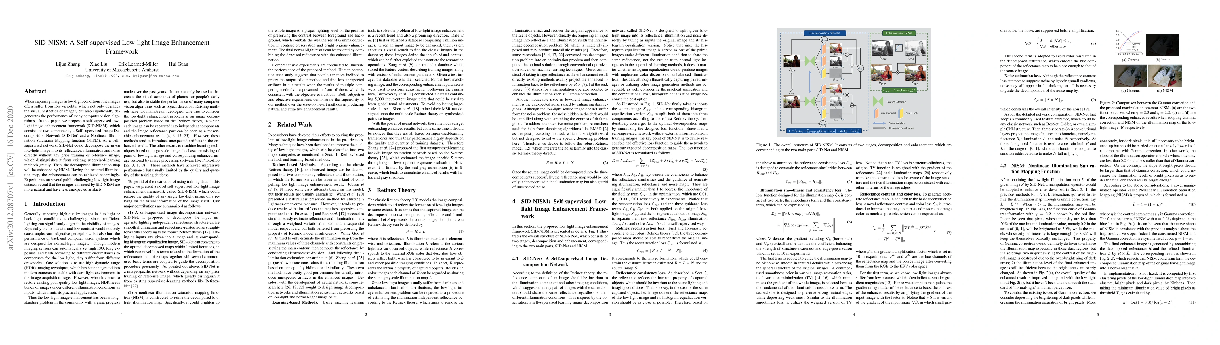 This paper proposes SID-NISM, a self-supervised framework for enhancing low-light images by decomposing them into reflectance, illumination, and noise using SID-Net, followed by illumination enhancement via NISM, resulting in more natural images with fewer artifacts compared to supervised methods.