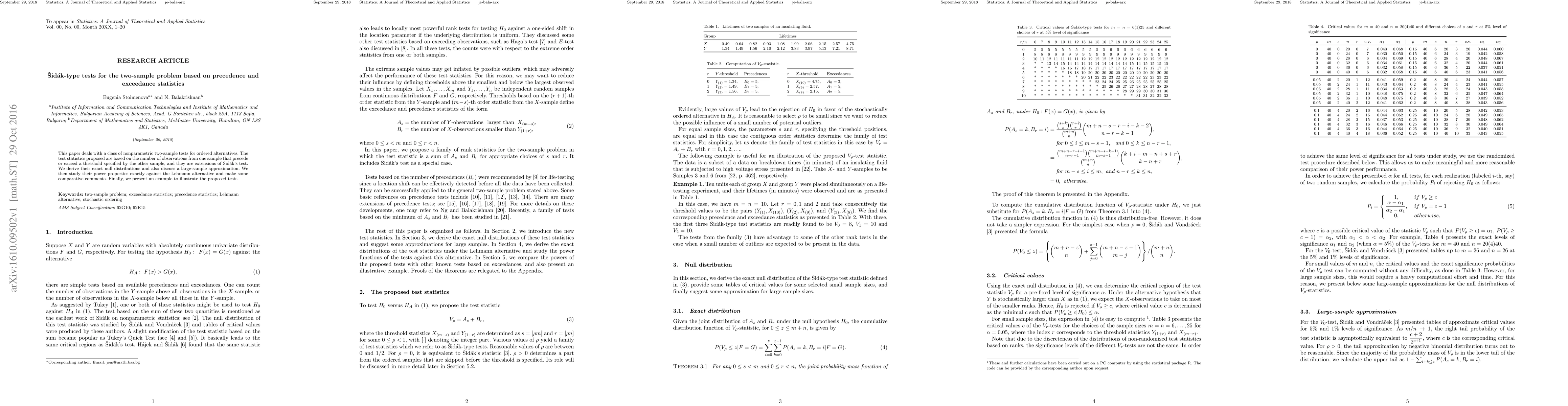 This paper proposes nonparametric two-sample tests based on precedence and exceedance statistics, extending \v{S}id\'ak's test. It derives exact null distributions and discusses large-sample approximations, evaluates power properties, and provides an illustrative example.