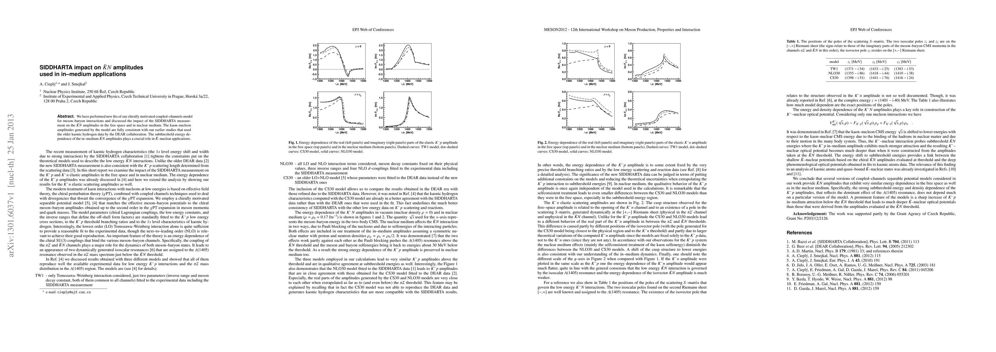 We have performed new fits of our chirally motivated coupled--channels model for meson-baryon interactions and discussed the impact of the SIDDHARTA measurement on the $\bar{K}N$ amplitudes in the free space and in nuclear medium. The kaon--nucleon amplitudes generated by the model are fully consistent with our earlier studies that used the older kaonic hydrogen data by the DEAR collaboration. The subthreshold energy dependence of the in-medium $\bar{K}N$ amplitudes plays a crucial role in $\bar{K}$--nuclear applications.