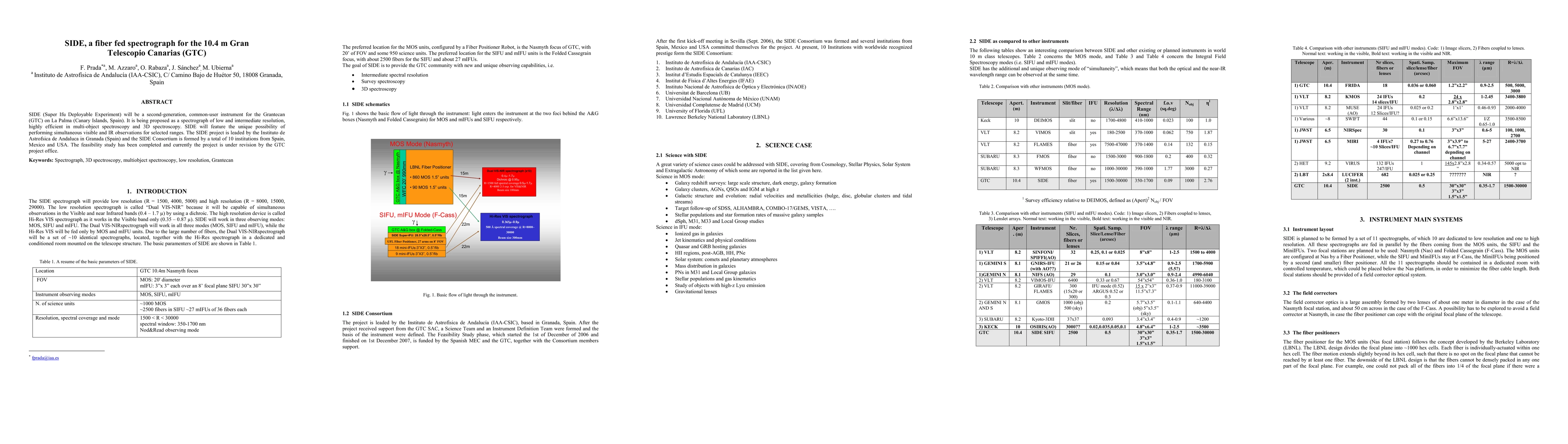 SIDE (Super Ifu Deployable Experiment) will be a second-generation, common-user instrument for the Grantecan (GTC) on La Palma (Canary Islands, Spain). It is being proposed as a spectrograph of low and intermediate resolution, highly efficient in multi-object spectroscopy and 3D spectroscopy. SIDE features the unique possibility of performing simultaneous visible and NIR observations for selected ranges. The SIDE project is leaded by the Instituto de Astrofisica de Andalucia (IAA-CSIC) in Granada (Spain) and the SIDE Consortium is formed by a total of 10 institutions from Spain, Mexico and USA. The SIDE Feasibility Study has been completed and currently the project is under revision by the GTC Project Office.