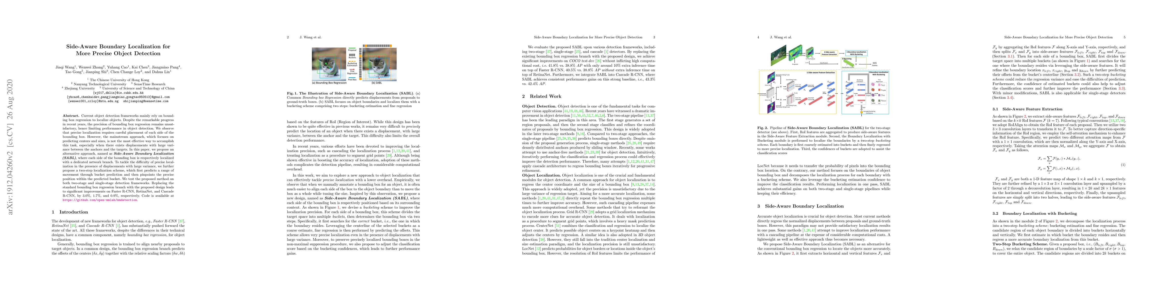 This paper proposes Side-Aware Boundary Localization (SABL) to enhance object detection precision by separately localizing each side of the bounding box with dedicated network branches. The method includes a two-step localization scheme to handle large displacements, leading to significant improvements in Faster R-CNN, RetinaNet, and Cascade R-CNN detection frameworks.