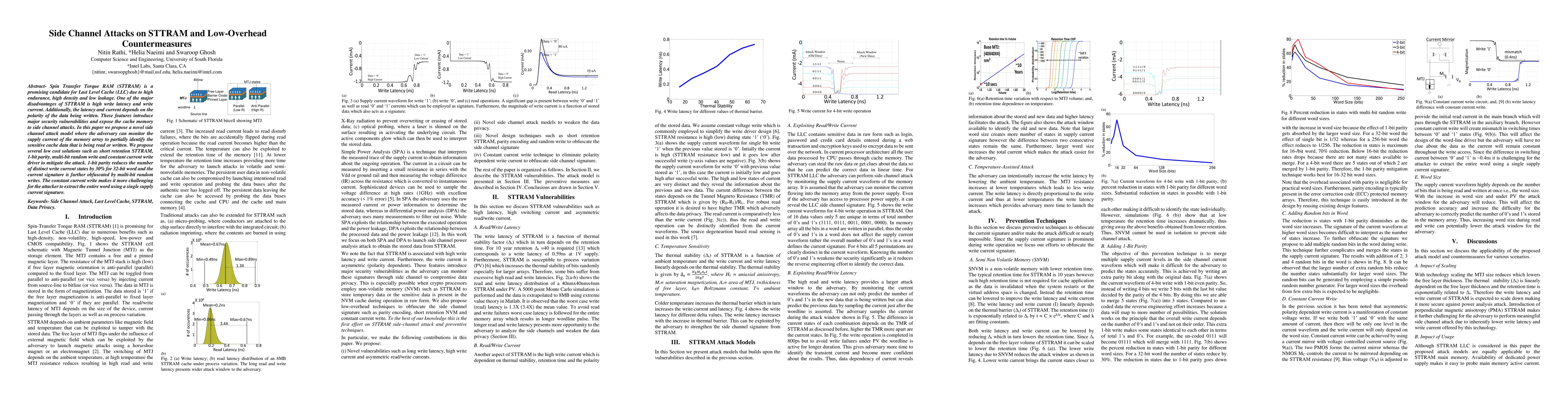 This paper investigates side channel attacks on STTRAM used in Last Level Caches, revealing vulnerabilities due to varying write latency and current based on data polarity. The authors propose countermeasures including short retention STTRAM, 1-bit parity, multi-bit random writes, and constant current write drivers to mitigate the attacks.