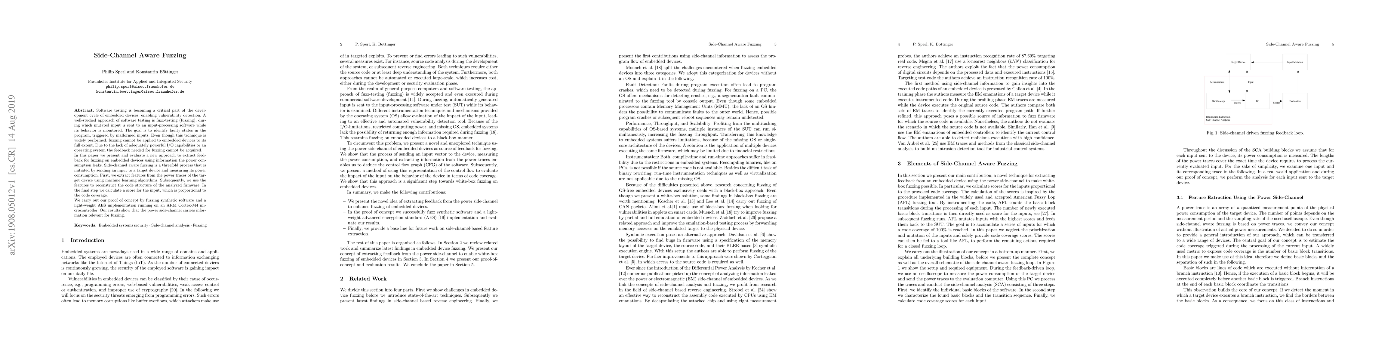 Software testing is becoming a critical part of the development cycle of embedded devices, enabling vulnerability detection. A well-studied approach of software testing is fuzz-testing (fuzzing), during which mutated input is sent to an input-processing software while its behavior is monitored. The goal is to identify faulty states in the program, triggered by malformed inputs. Even though this technique is widely performed, fuzzing cannot be applied to embedded devices to its full extent. Due to the lack of adequately powerful I/O capabilities or an operating system the feedback needed for fuzzing cannot be acquired. In this paper we present and evaluate a new approach to extract feedback for fuzzing on embedded devices using information the power consumption leaks. Side-channel aware fuzzing is a threefold process that is initiated by sending an input to a target device and measuring its power consumption. First, we extract features from the power traces of the target device using machine learning algorithms. Subsequently, we use the features to reconstruct the code structure of the analyzed firmware. In the final step we calculate a score for the input, which is proportional to the code coverage. We carry out our proof of concept by fuzzing synthetic software and a light-weight AES implementation running on an ARM Cortex-M4 microcontroller. Our results show that the power side-channel carries information relevant for fuzzing.