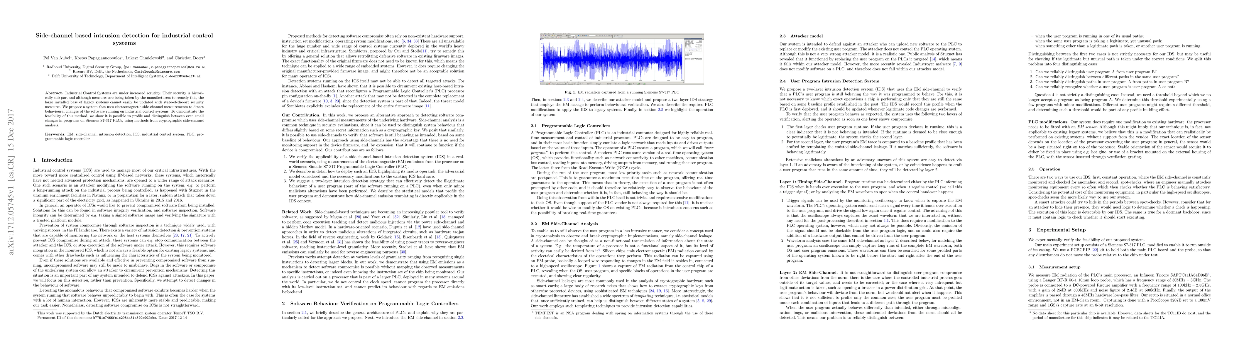 Industrial Control Systems are under increased scrutiny. Their security is historically sub-par, and although measures are being taken by the manufacturers to remedy this, the large installed base of legacy systems cannot easily be updated with state-of-the-art security measures. We propose a system that uses electromagnetic side-channel measurements to detect behavioural changes of the software running on industrial control systems. To demonstrate the feasibility of this method, we show it is possible to profile and distinguish between even small changes in programs on Siemens S7-317 PLCs, using methods from cryptographic side-channel analysis.